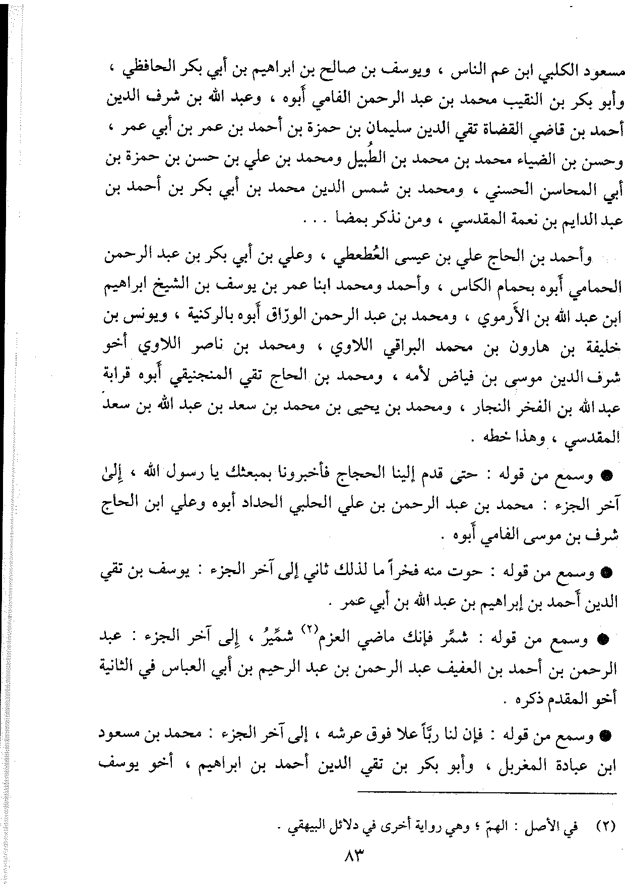 وسمع من قوله: حتى قدم إلينا الحجاج فأخبرونا بمبعثك يا رسول الله إلى آخر الجزء: محمد بن عبد الرحمن بن علي الحلبي الحداد أبوه وعلي ابن الحاج شرف بن موسى الفامي أبوه.
