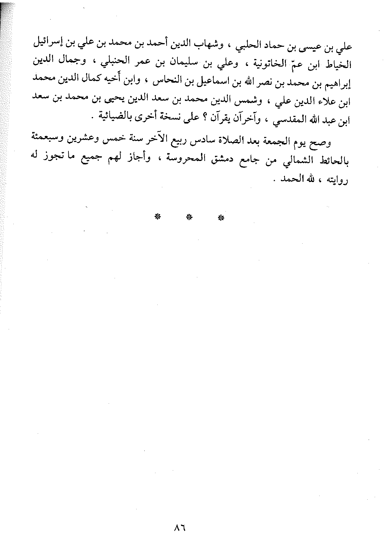 علي بن عيسى بن حماد الحلبي، وشهاب الدين أحمد بن محمد ابن علي بن إسرائيل الخياط ابن عم الخاتونية، وعلي بن سليمان بن عمر الحنبلي، وجمال الدين إبراهيم بن محمد بن نصر الله بن إسماعيل بن النحاس، وابن أخيه كمال الدين محمد بن علاء الدين علي، وشمس الدين محمد بن سعد الدين يحيى بن محمد بن سعد بن عبد الله المقدسي، وآخران يقرآن "؟ " على نسخة أخرى بالضيائية وصحّ يوم الجمعة بعد الصلاة سادس ربيع الآخر سنة خمس وعشرين وسبعمئة بالحائط الشمالي من جامع دمشق المحروسة، وأجاز لهم جميع ما يجوز له روايته، لله الحمد.