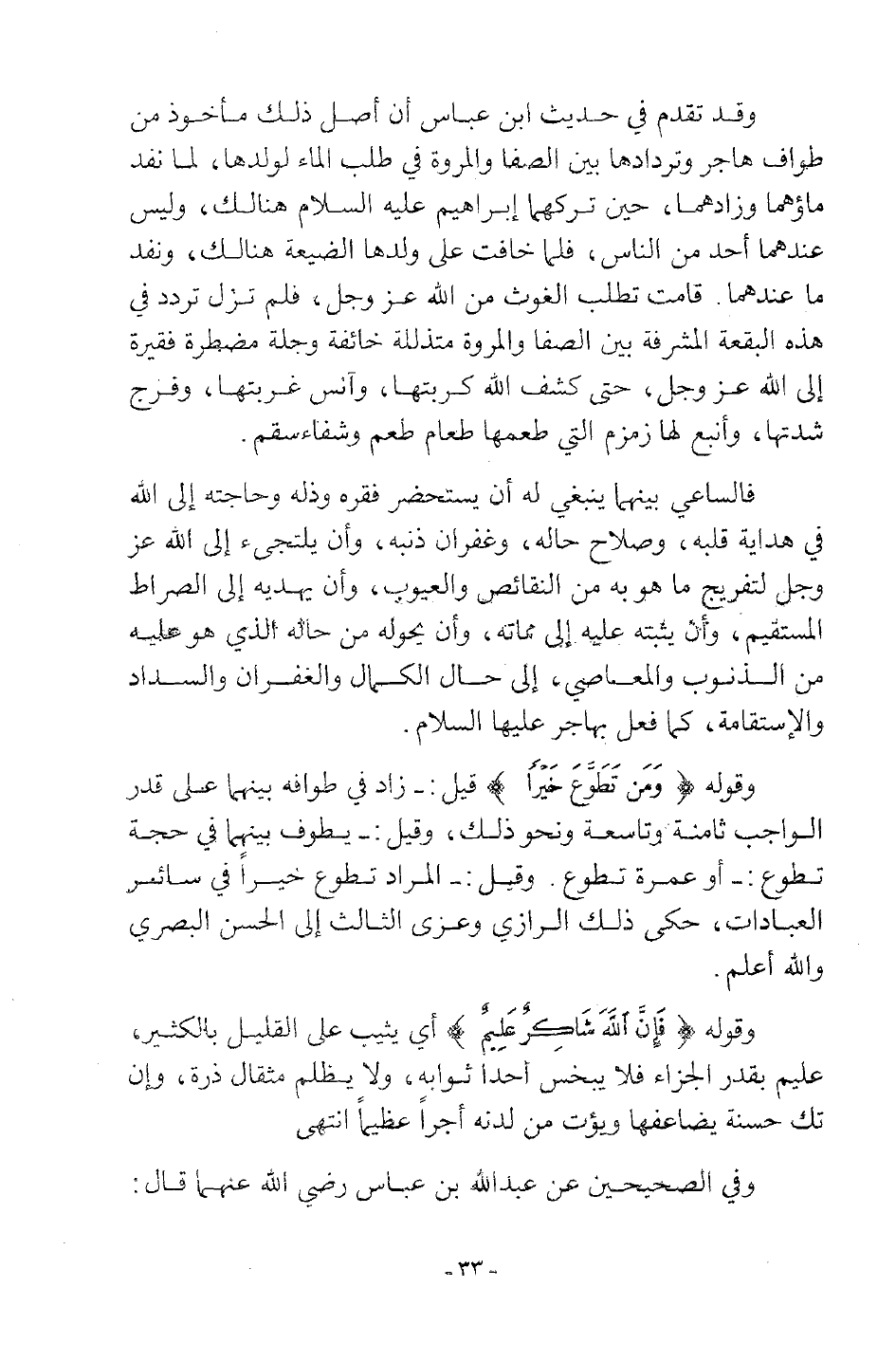 حَجَّ الْبَيْتَ أَوِ اعْتَمَرَ فَلا جُنَاحَ عَلَيْهِ أَنْ يَطَّوَّفَ بِهِمَا وَمَنْ تَطَوَّعَ خَيْراً فَإِنَّ اللَّهَ شَاكِرٌ عَلِيمٌ} [البقرة: من الآية158] ، قال رحمه الله: ـ قال الإمام أحمد: ـ حدثنا سليمان بن داود الهاشمي أنبأنا إبراهيم بن سعد عن الزهري عن عروة عن عائشة قالت: قلت: أرأيت قول الله تعالى {إِنَّ الصَّفَا وَالْمَرْوَةَ مِنْ شَعَائِرِ اللَّهِ فَمَنْ حَجَّ الْبَيْتَ أَوِ اعْتَمَرَ فَلا جُنَاحَ عَلَيْهِ أَنْ يَطَّوَّفَ بِهِمَا} [البقرة: من الآية158] قلت: ـ فوالله ما على أحد من جناح أن لا يتطوف بهما، فقالت عائشة: ـ بئس ما قلت يا ابن أختي، إنها لو كانت على ما أوّلتها عليه كانت: ـ "فلا جناح عليه أن لا يطوف بهما" ولكنَّها إنما أنزلت: أن الأنصار كانوا قبل أن يُسْلِموا كانوا يهلون لمناة الطاغية التي كانوا يعبدونها عند المشلل، وكان من أهَلَّ لها يتحرج أن يطوف بالصفا والمروة، فسألوا عن ذلك رسول الله صلى الله عليه وسلم، فقالوا يا رسول الله: ـ إنا كنا نتحرج أن نطوف بالصفا والمروة في الجاهلية، فأنزل الله عز وجل {إِنَّ الصَّفَا وَالْمَرْوَةَ مِنْ شَعَائِرِ اللَّهِ فَمَنْ حَجَّ الْبَيْتَ أَوِ اعْتَمَرَ فَلا جُنَاحَ عَلَيْهِ أَنْ يَطَّوَّفَ بِهِمَا وَمَنْ تَطَوَّعَ خَيْراً فَإِنَّ اللَّهَ شَاكِرٌ عَلِيمٌ} [البقرة:158] .