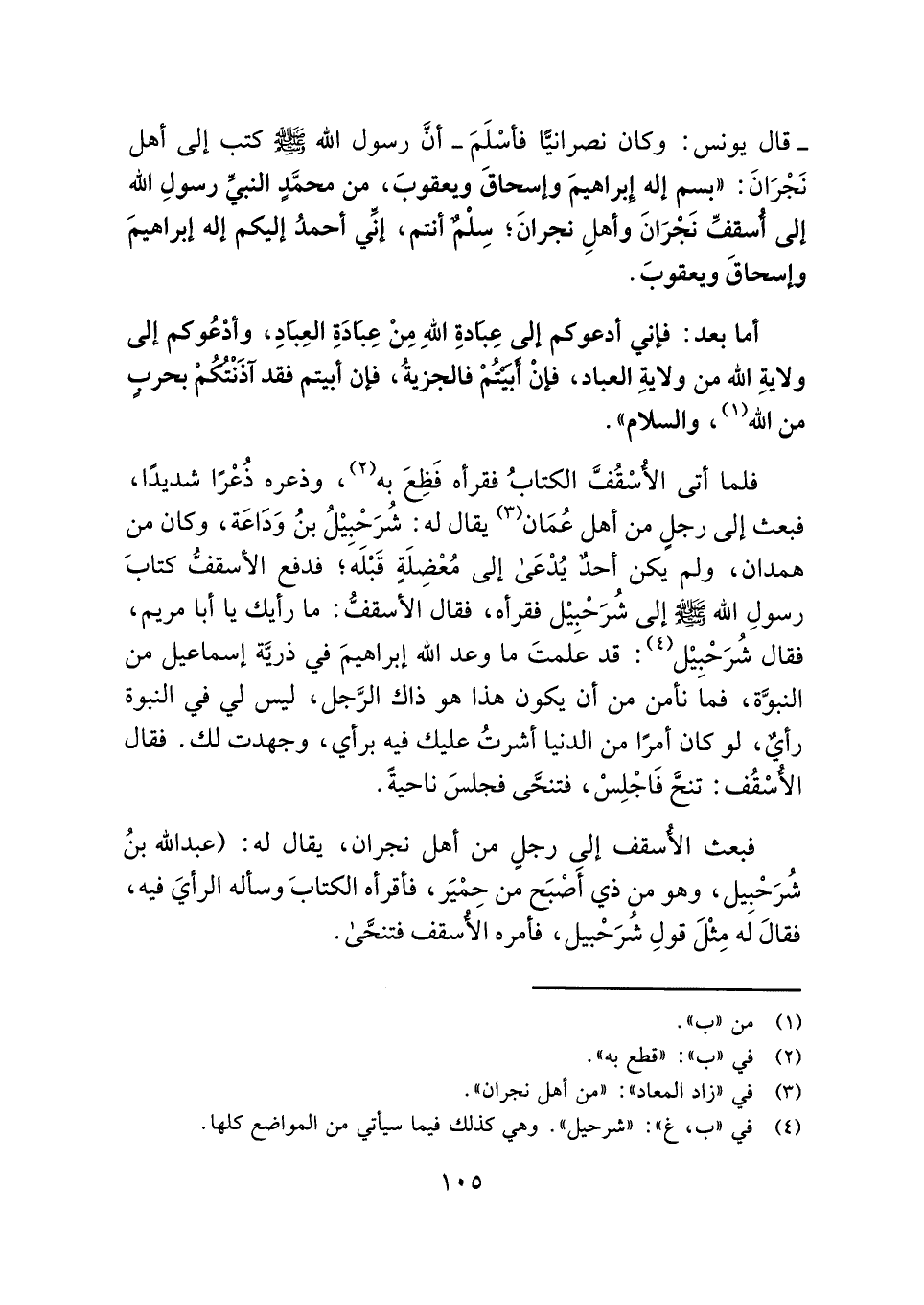 -قال يونس: وكان نصرانيًّا فأسْلَمَ- أنَّ رسول الله - صلى الله عليه وسلم - كتب إلى أهل نَجْرَانَ: "بسم إله إِبراهيمَ وإسحاقَ ويعقوبَ، من محمَّدٍ النبيِّ رسولِ الله إلى أُسقفِّ نَجْرَانَ وأهلِ نجرانَ؛ سِلْمٌ أنتم، إنِّي أحمدُ إليكم إله إبراهيمَ وإسحاقَ ويعقوبَ.