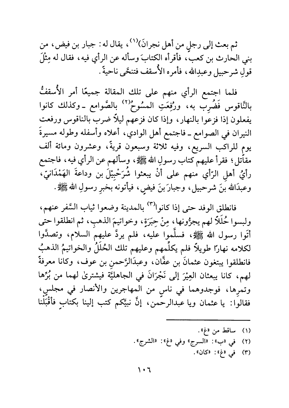 فانطلق الوفد حتى إذا كانوا (¬٣) بالمدينة وضعوا ثياب السَّفر عنهم، ولبسوا حُلَلًا لهم يجرُّونها، مِنْ حِبَرَةٍ، وخواتيمَ الذهبِ، ثم انطلقوا حتى أتَوا رسول الله - صلى الله عليه وسلم -، فسلَّموا عليه، فلم يردَّ عليهمَ السلام، وتصدَّوا لكلامه نهارًا طويلًا فلم يكلِّمهم وعليهم تلك الحُلَلُ والخواتيمُ الذهبُ فانطلقوا يبتغون عثمانَ بن عفَّان، وعبدَ الرَّحمنِ بن عوف، وكانا معرفةً لهم، كانا يبعثان العِيْرَ إلى نَجْرَانَ في الجاهليَّة فيشترى لهما من بُرِّها وتمرِها، فوجدوهما في ناسٍ من المهاجرين والأنصار في مجلسٍ، فقالوا: يا عثمان ويا عبد الرحمن، إنَّ نبيَّكم كتب إلينا بكتابٍ فأقْبَلْنا