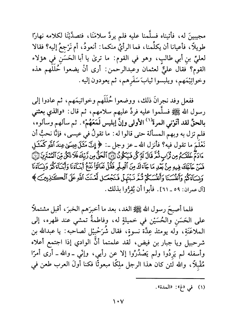 فلما أصبحَ رسول الله - صلى الله عليه وسلم - الغد، بعد ما أخبرَهم الخبرَ، أقبل مشتملًا على الحَسَنِ والحُسَيْن في خميلةٍ له، وفاطمةُ تمشي عند ظهره، إلى الملاعَنَةِ، وله يومئذ عِدَّة نسوةٍ، فقال شُرَحْبِيْل لصاحبه: يا عبد الله بن شرجبيل ويا جبار بن فيض، لقد علمتما أنًّ الوادي إذا اجتمع أعلاه وأسفله لم يَرِدُوا ولم يَصْدُرُوا إلا عن رأيى، وإنّي -والله- أرى أمرًا مُقْبِلًا، والله لئن كان هذا الرجل ملِكًا مبعوثًا فكنا أولَ العرب طعن في