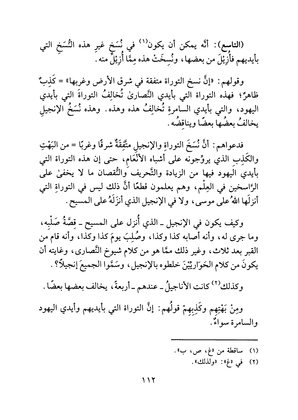 وقولهم: "إنَّ نسخ التوراة متفقة في شرق الأرض وغربها" = كَذِبٌ ظاهرٌ؛ فهذه التوراة التي بأيدي النَّصارى تُخالِفُ التوراةَ التي بأيدي اليهود، والتي بأيدي السامرةِ تُخالِفُ هذه وهذه. وهذه نُسَخُ الإنجيلِ يخالفُ بعضُها بعضًا ويناقِضُه.