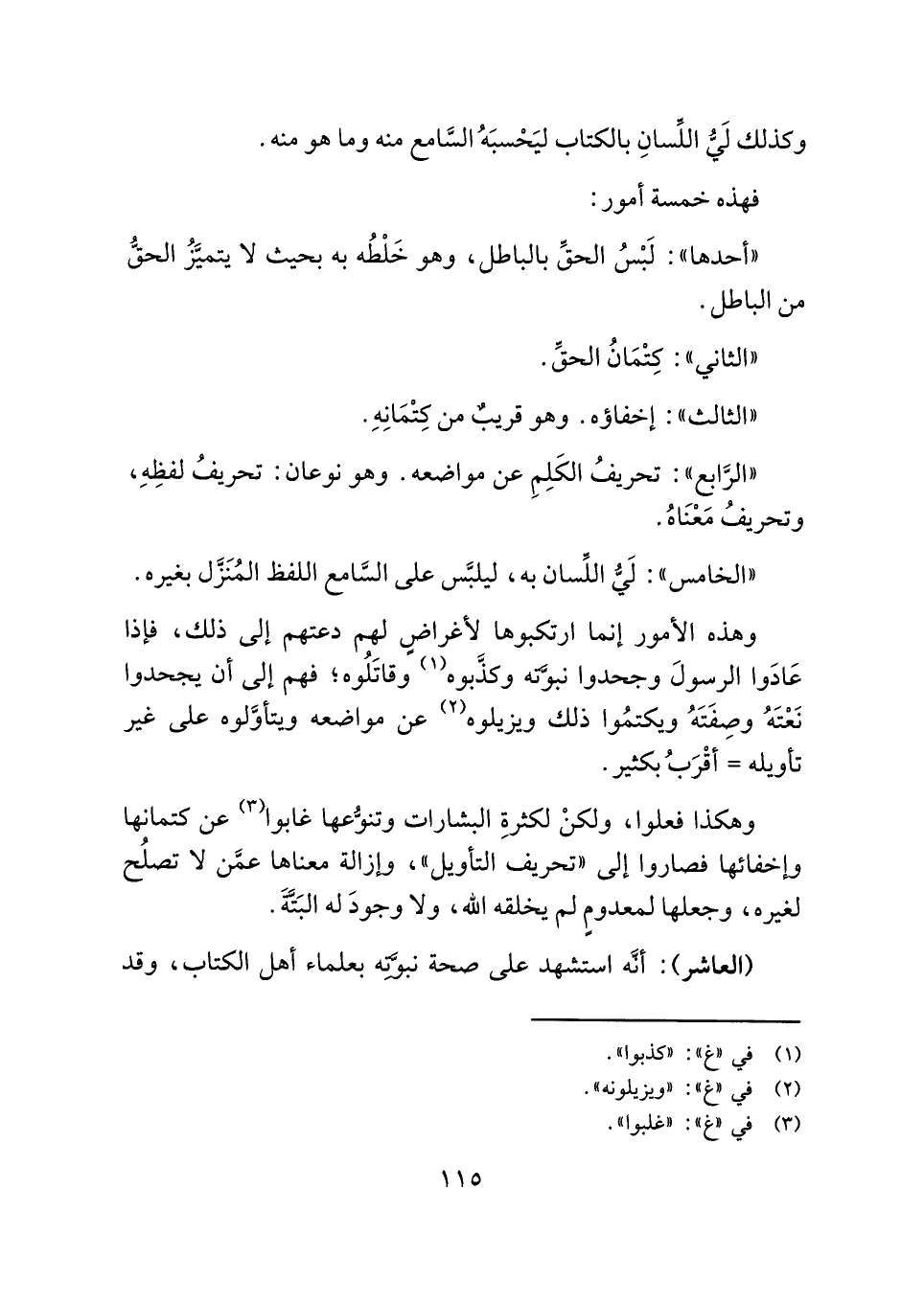 "الخامس": لَيُّ اللِّسان به، ليلبَّس على السَّامع اللفظ المُنَزَّل بغيره.