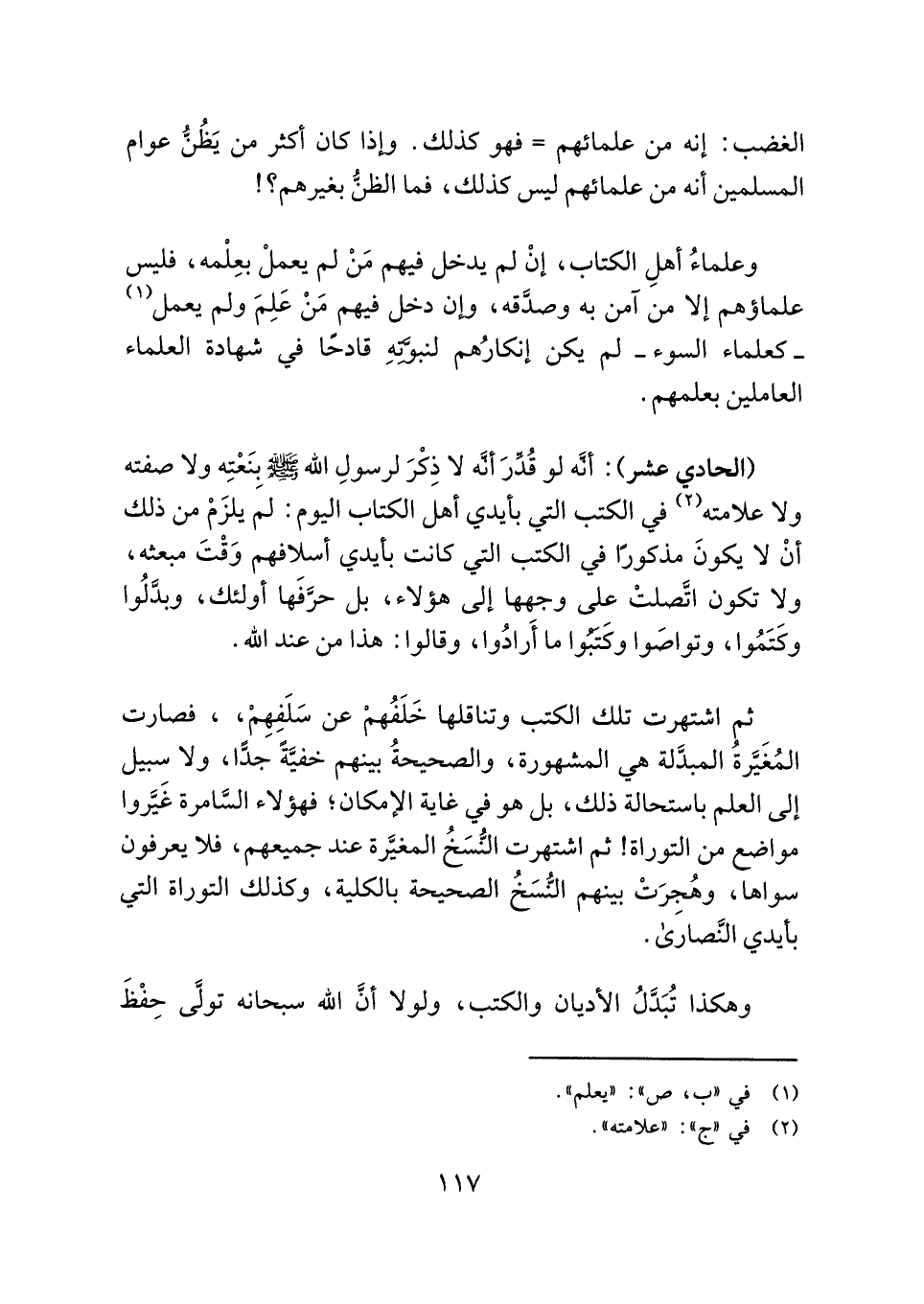 (الحادي عشر): أنِّه لو قُدِّرَ أنِّه لا ذِكْرَ لرسولِ الله - صلى الله عليه وسلم - بنَعْتِه ولا صفته ولا علامته (¬٢) في الكتب التي بأيدي أهل الكتاب اليوم: لمَ يلزَمْ من ذلك أنْ لا يكونَ مذكورًا في الكتب التي كانت بأيدي أسلافهم وَقْتَ مبعثه، ولا تكون اتَّصلتْ على وجهها إلى هؤلاء، بل حرَّفَها أولئك، وبدَّلُوا وكَتَمُوا، وتواصَوا وكَتَبُوا ما أَرادُوا، وقالوا: هذا من عند الله.