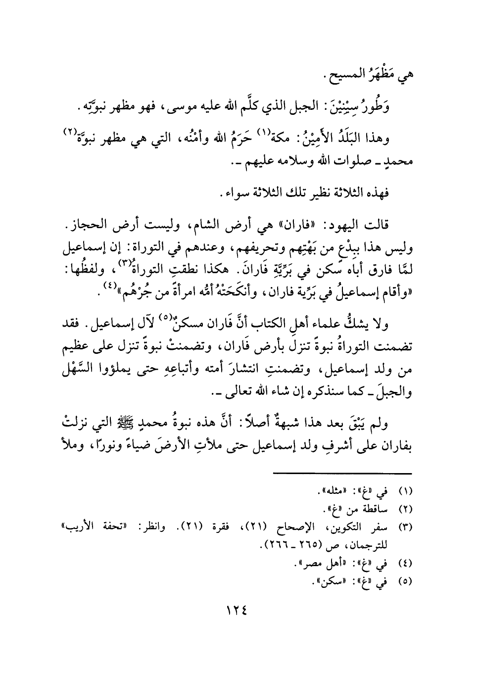 ولا يشكُّ علماء أهلِ الكتاب أنَّ فَاران مسكنٌ (¬٥) لآل إسماعيل. فقد تضمنت التوراةُ نبوةً تنزل بأرض فَاران، وتضمنتْ نبوةً تنزل علي عظيم من ولد إسماعيل، وتضمنتِ انتشارَ أمته وأتباعِهِ حتي يملؤوا السَّهْل والجبلَ -كما سنذكره إن شاء الله تعالي-.