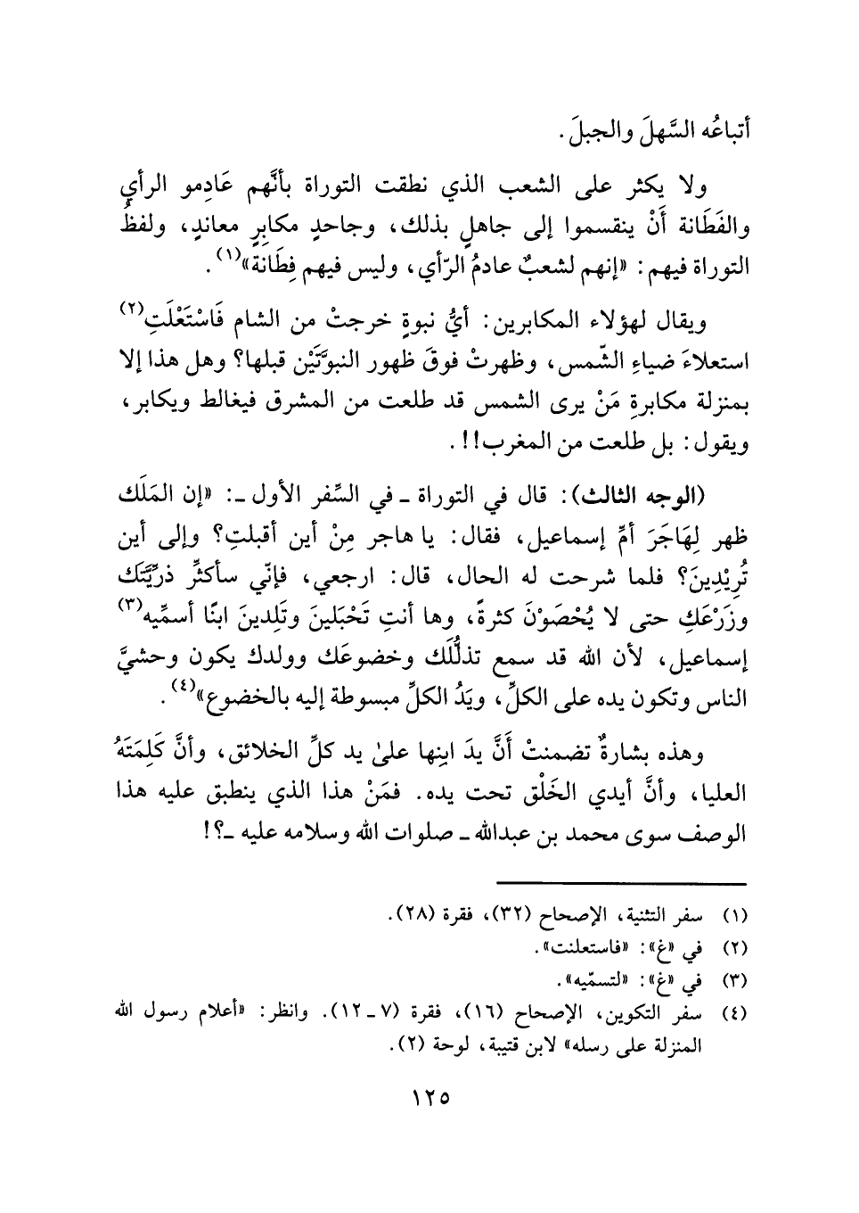 (الوجه الثالث): قال في التوراة -في السِّفر الأول-: "إن المَلَك ظهر لِهَاجَرَ أمِّ إسماعيل، فقال: يا هاجر مِنْ أين أقبلتِ؟ وإلي أين تُرِيْدِينَ؟ فلما شرحت له الحال، قال: ارجعي، فإنّي سأكثِّر ذرِّيَّتَك وزَرْعَكِ حتي لا يُحْصَوْنَ كثرةً، وها أنتِ تَحْبَلينَ وتَلِدينَ ابنًا أسمِّيه (¬٣) إسماعيل، لأن الله قد سمع تذلُّلَك وخضوعَك وولدك يكون وحشيَّ الناس وتكون يده علي الكلِّ، ويَدُ الكلِّ مبسوطة إليه بالخضوع" (¬٤).