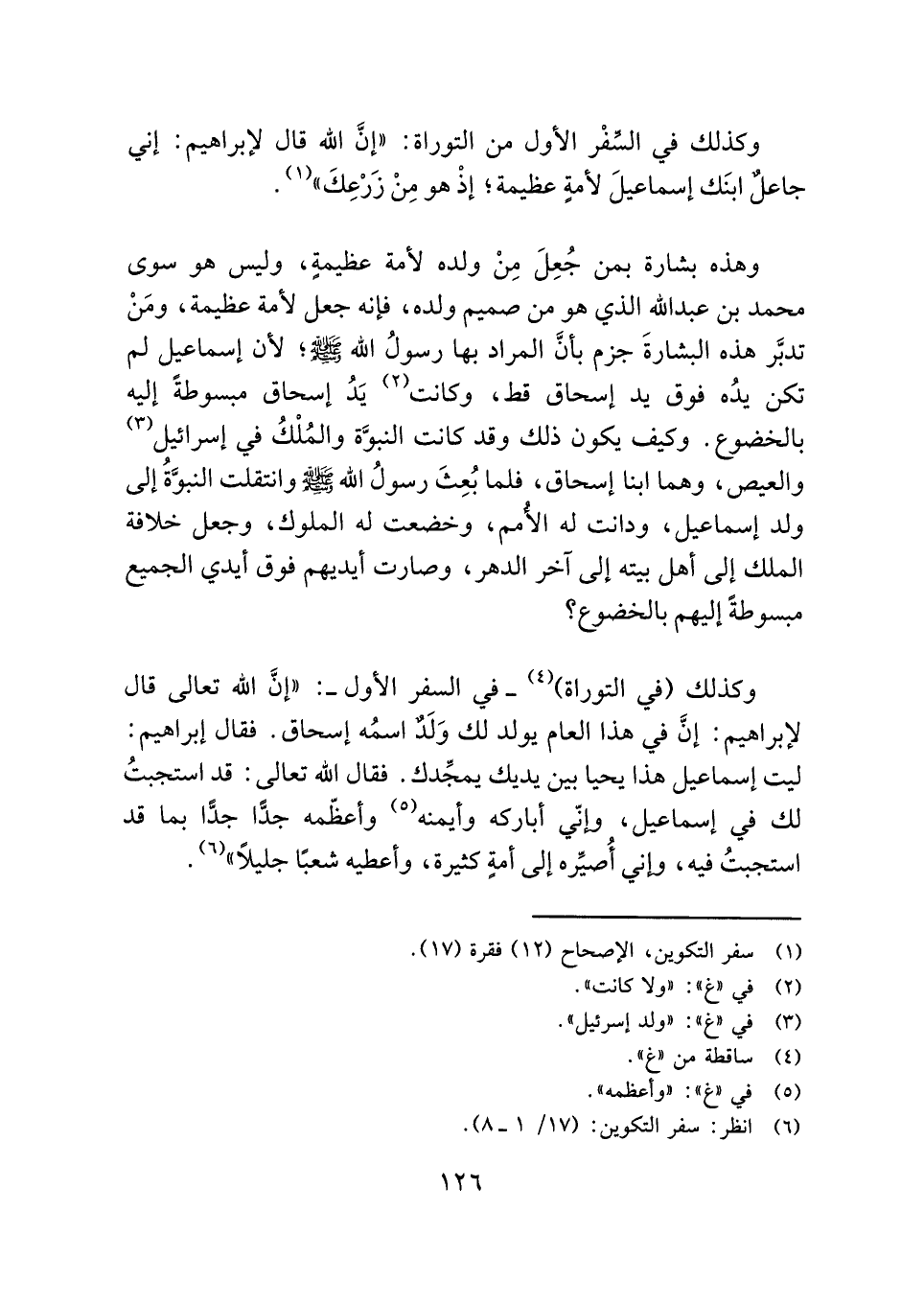وكذلك (في التوراة) (¬٤) -في السفر الأول-: "إنَّ الله تعالي قال لإبراهيم: إنَّ في هذا العام يولد لك وَلَدٌ اسمُه إسحاق. فقال إبراهيم: ليت إسماعيل هذا يحيا بين يديك يمجِّدك. فقال الله تعالي: قد استجبتُ لك في إسماعيل، وإنّي أباركه وأيمنه (¬٥) وأعظّمه جدًّا جدًّا بما قد استجبتُ فيه، وإني أُصيِّره إلي أمةٍ كثيرة، وأعطيه شعبًا جليلًا" (¬٦) .