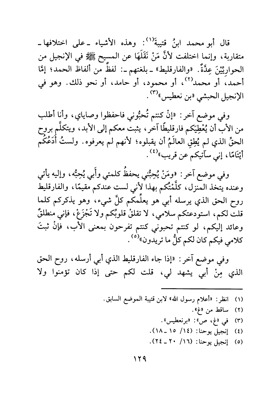 قال أبو محمد ابنُ قتيبةَ (¬١) : وهذه الأشياء -علي اختلافها- متقاربة، وإنما اختلفت لأنَّ مَنْ نَقَلَهَا عن المسيح - صلى الله عليه وسلم - في الإنجيل من الحوارِيِّيْنَ عِدَّةٌ. "والفارقليط" -بلغتهم-: لفظ من ألفاظ الحمد؛ إمَّا أحمد، أو محمد (¬٢) ، أو محمود، أو حامد، أو نحو ذلك. وهو في الإنجيل الحبشي "بن نعطيس" (¬٣) .