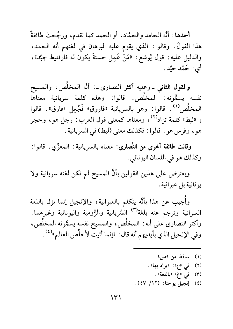 وأُجيب عن هذا بأنَّه يتكلم بالعبرانية، والإنجيل إنما نزل باللغة العبرانية وترجم عنه بلغة (¬٣) السِّريانية والرُّومية واليونانية وغيرهما. وأكثر النصاري علي أنه: المخلِّص، والمسيح نفسه يسمُّونه المخلِّص، وفي الإنجيل الذي بأيديهم أنه قال: "إنما أتيت لأخلِّص العالم" (¬٤) .