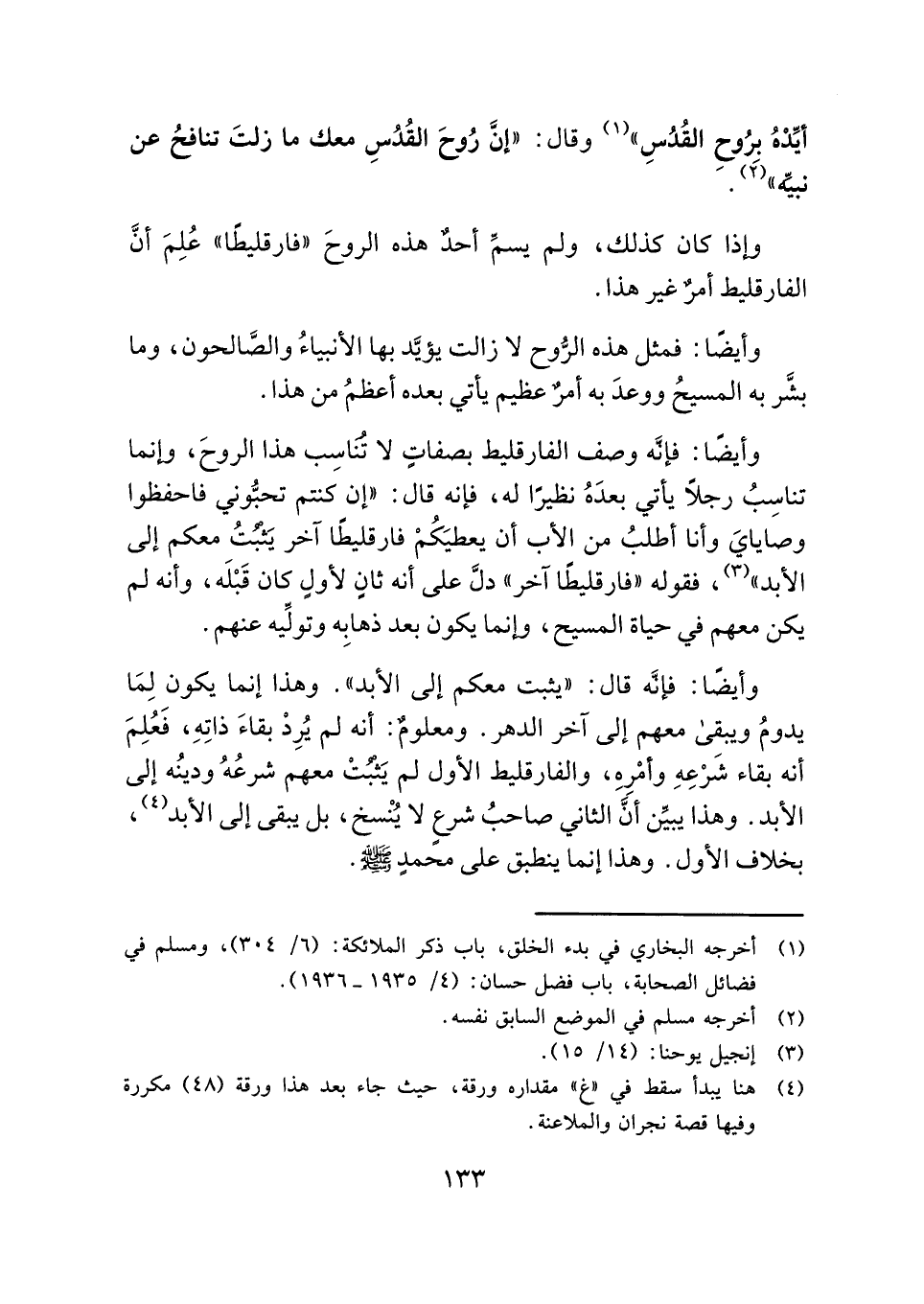 وأيضًا: فإنَّه وصف الفارقليط بصفاتٍ لا تناسِب هذا الروحَ، وإنما تناسِبُ رجلًا يأتي بعدَهُ نظيرًا له، فإنه قال: "إن كنتم تحبُّوني فاحفظوا وصايايَ وأنا أطلبُ من الأب أن يعطيَكُمْ فارقليطًا آخر يَثْبُتُ معكم إلي الأبد" (¬٣) ، فقوله "فارقليطًا آخر" دلَّ علي أنه ثانٍ لأولٍ كان قَبْلَه، وأنه لم يكن معهم في حياة المسيح، وإنما يكون بعد ذهابِه وتولِّيه عنهم.