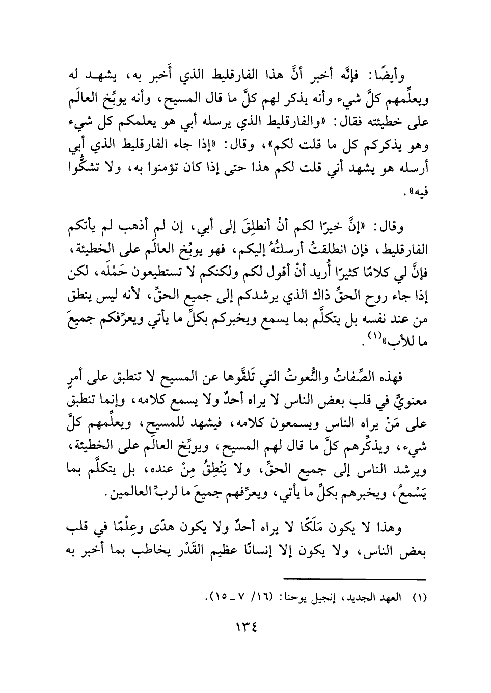 وأيضًا: فإنَّه أخبر أنَّ هذا الفارقليط الذي أَخبر به، يشهد له ويعلِّمهم كلَّ شيء وأنه يذكر لهم كلَّ ما قال المسيح، وأنه يوبِّخ العالَم علي خطيئته فقال: "والفارقليط الذي يرسله أبي هو يعلمكم كل شيء وهو يذكركم كل ما قلت لكم"، وقال: "إذا جاء الفارقليط الذي أبي أرسله هو يشهد أني قلت لكم هذا حتي إذا كان تؤمنوا به، ولا تشكُّوا فيه".
