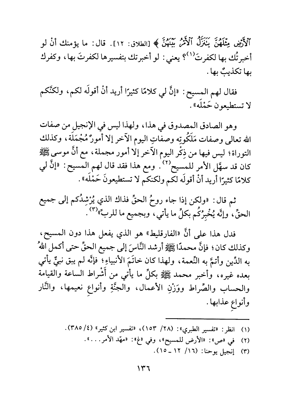 فدل هذا علي أنَّ "الفارقليط" هو الذي يفعل هذا دون المسيح، وكذلك كان؛ فإنَّ محمدًا - صلى الله عليه وسلم - أرشد النَّاسَ إلي جميع الحقِّ حتي أكمل اللهُ به الدِّين وأتمَّ به النِّعمة، ولهذا كان خاتَمَ الأنبياءِ؛ فإنَّه لم يبق نبيٌّ يأتي بعده غيره، وأخبر محمد - صلى الله عليه وسلم - بكلِّ ما يأتي من أَشْراط الساعة والقيامة والحساب والصِّراط ووَزْنِ الأعمال، والجنَّةِ وأنواعِ نعيمها، والنَّار وأنواعِ عذابها.