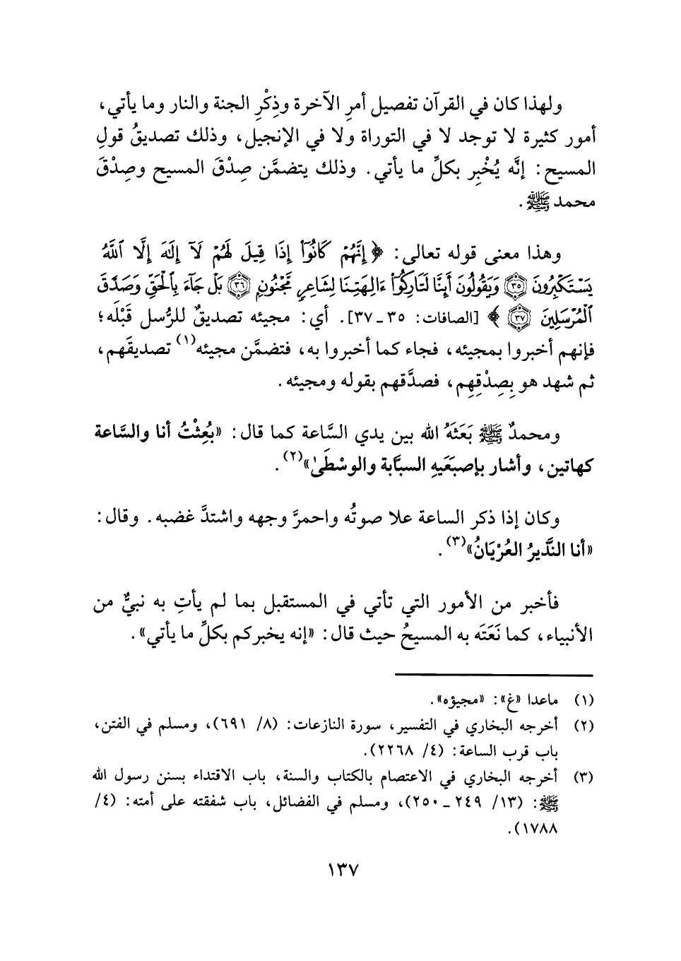 ولهذا كان في القرآن تفصيل أمرِ الآخرة وذِكْرِ الجنة والنار وما يأتي، أمور كثيرة لا توجد لا في التوراة ولا في الإنجيل، وذلك تصديقُ قولِ المسيح: إنَّه يُخْبِر بكلِّ ما يأتي. وذلك يتضمَّن صِدْقَ المسيح وصِدْقَ محمد - صلى الله عليه وسلم -.