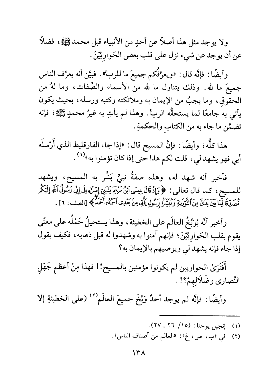 وأخبر أنَّه يُوَبِّخُ العالَم علي الخطيئة، وهذا يستحيلُ حَمْلُه علي معنًى يقوم بقلب الحَوارِيِّيْنَ؛ فإنهم آمنوا به وشهدوا له قبل ذهابه، فكيف يقول إذا جاء فإنه يشهد لي ويوصيهم بالإيمان به؟