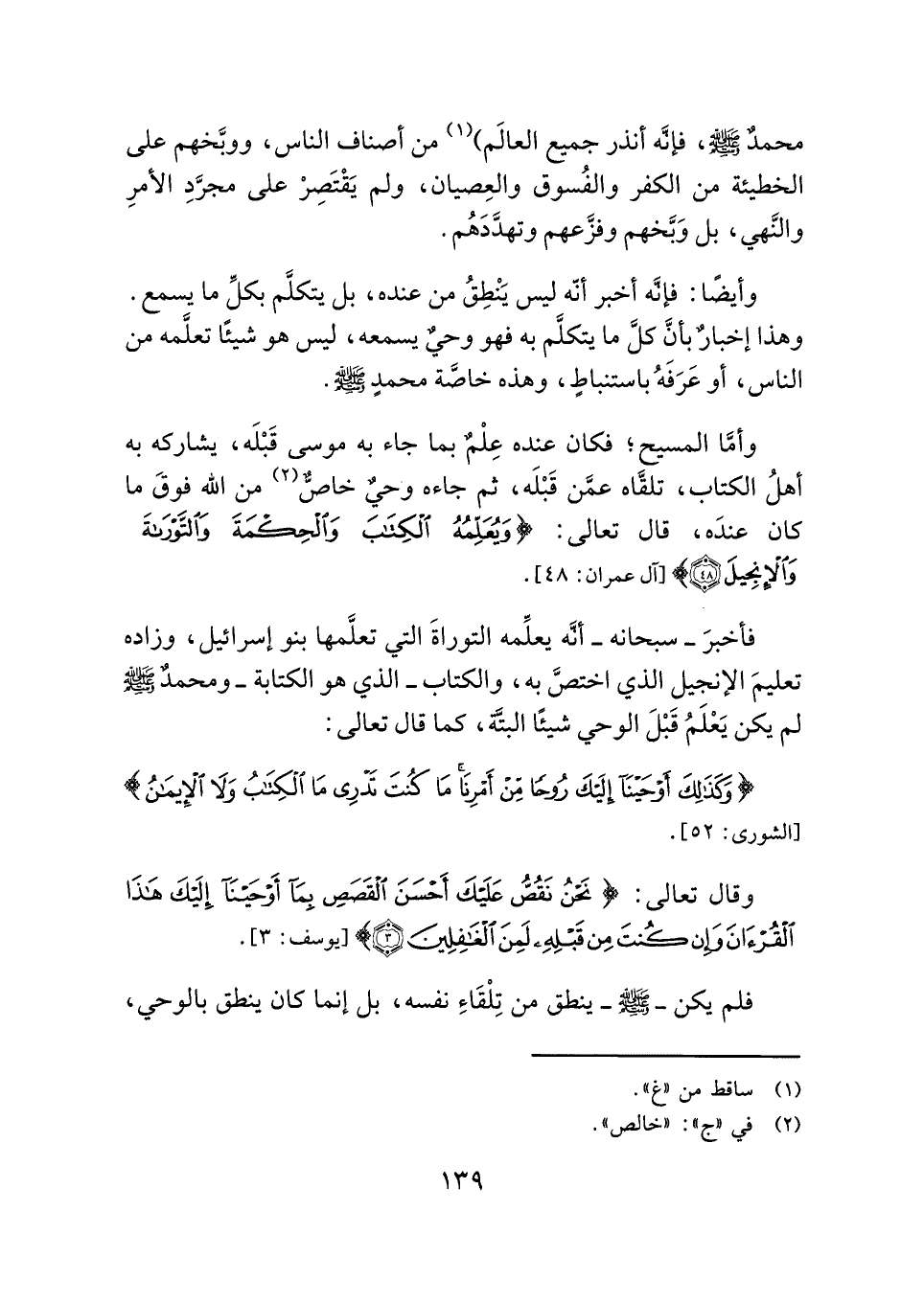 وأمَّا المسيح؛ فكان عنده عِلْمٌ بما جاء به موسي قَبْلَه، يشاركه به أهلُ الكتاب، تلقَّاه عمَّن قَبْلَه، ثم جاءه وحيٌ خاصٌّ (¬٢) من الله فوقَ ما كان عندَه، قال تعالي: {وَيُعَلِّمُهُ الْكِتَابَ وَالْحِكْمَةَ وَالتَّوْرَاةَ وَالْإِنْجِيلَ (٤٨) } [آل عمران: ٤٨].