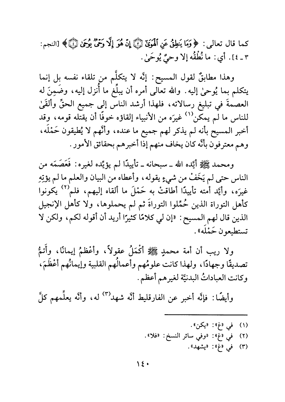 وهذا مطابقٌ لقول المسيح: إنَّه لا يتكلَّم من تلقاء نفسه بِل إنما يتكلم بما يُوحي إليه. والله تعالي أمره أن يبلِّغ ما أُنزل إليه، وضمِنَ له العصمةَ في تبليغ رسالاته، فلهذا أرشد الناس إلي جميع الحقِّ وألقَي للناس ما لم يمكن (¬١) غيرَه من الأنبياء إلقاؤه خوفًا أن يقتله قومه، وقد أخبر المسيح بأنه لم يذكر لهم جميع ما عنده، وأنَّهم لا يُطيقون حَمْلَه، وهم معترفون بأنَّه كان يخاف منهم إذا أخبرهم بحقائق الأمور.