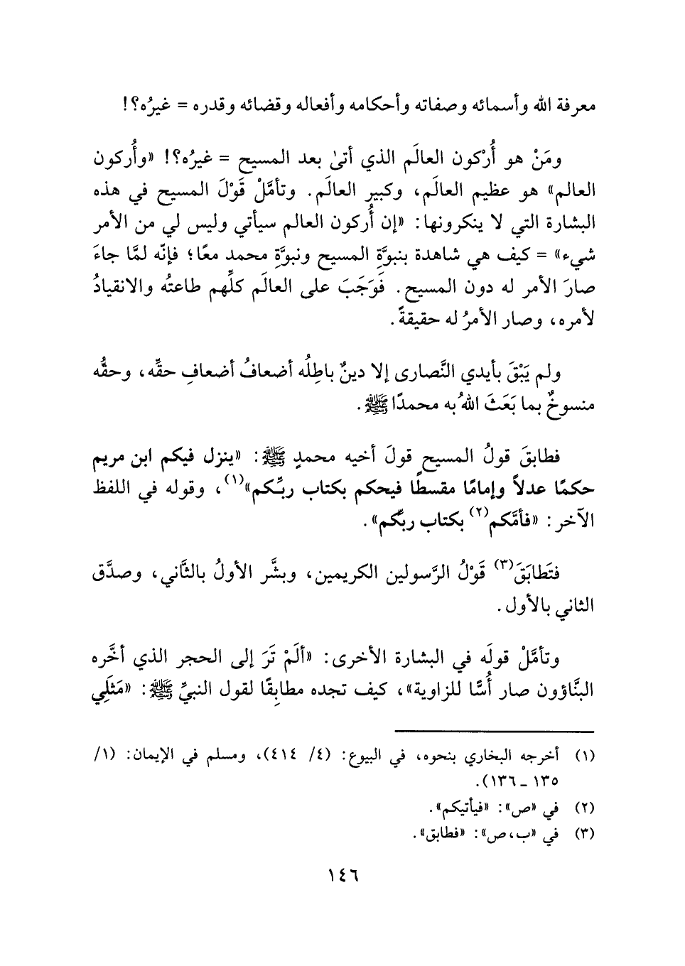فطابقَ قولُ المسيح قولَ أخيه محمدٍ - صلى الله عليه وسلم -: "ينزل فيكم ابن مريم حكمًا عدلًا وإمامًا مقسطًا فيحكم بكتاب ربِّكم" (¬١) ، وقوله في اللفظ الآخر: "فأمَّكم (¬٢) بكتاب ربِّكم".