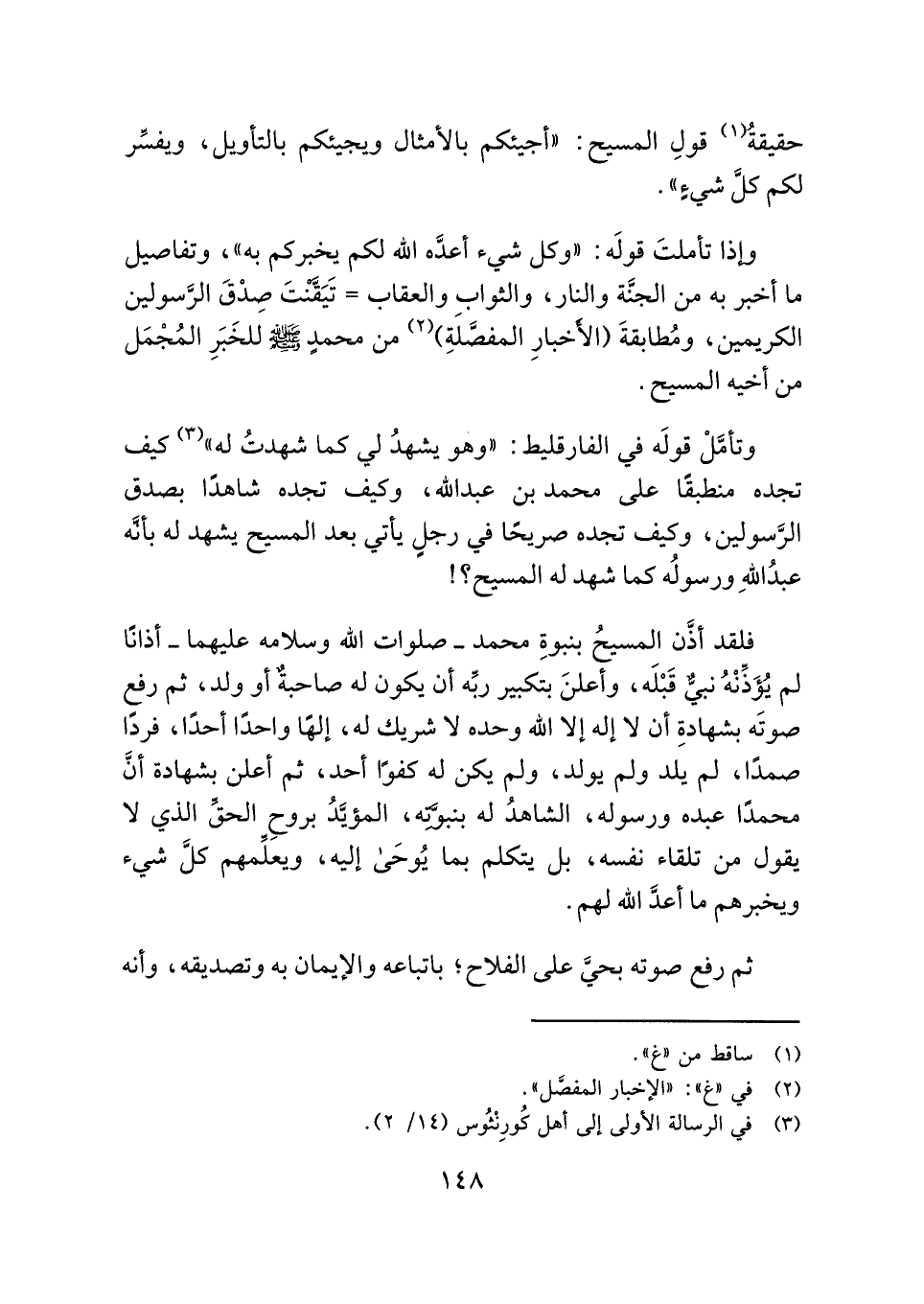 وتأمَّلْ قولَه في الفارقليط: "وهو يشهدُ لي كما شهدتُ له" (¬٣) كيف تجده منطبقًا علي محمد بن عبد الله، وكيف تجده شاهدًا بصدق الرَّسولين، وكيف تجده صريحًا في رجل يأتي بعد المسيح يشهد له بأنَّه عبدُ اللهِ ورسولُه كما شهد له المسيح؟!