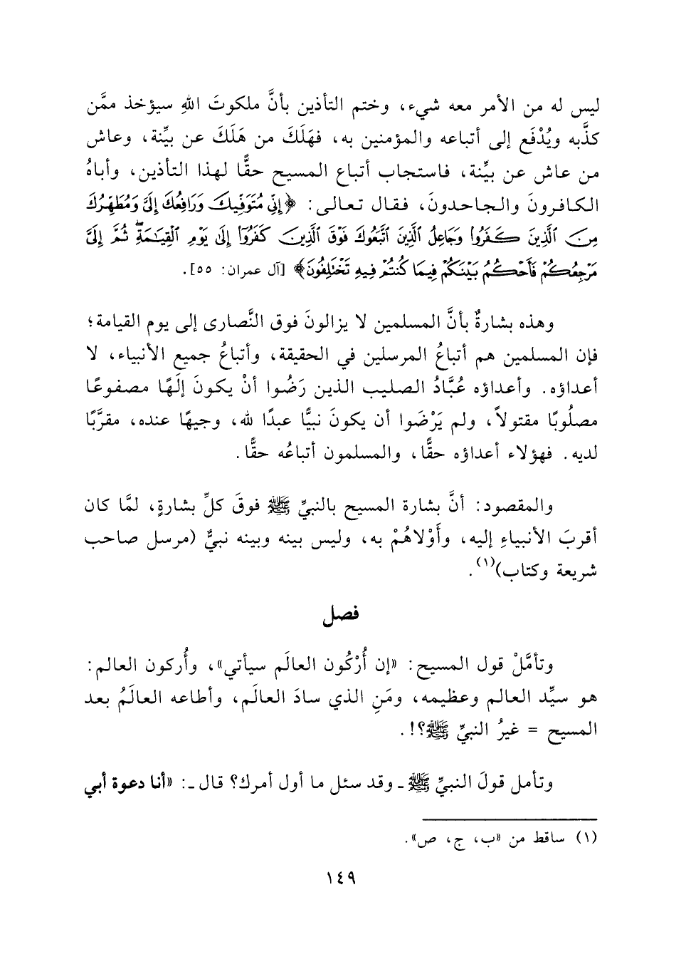 والمقصود: أنَّ بشارة المسيح بالنبيِّ - صلى الله عليه وسلم - فوقَ كلِّ بشارةٍ، لمَّا كان أقربَ الأنبياءِ إليه، وأَوْلاهُمْ به، وليس بينه وبينه نبيٌّ (مرسل صاحب شريعة وكتاب) (¬١) .