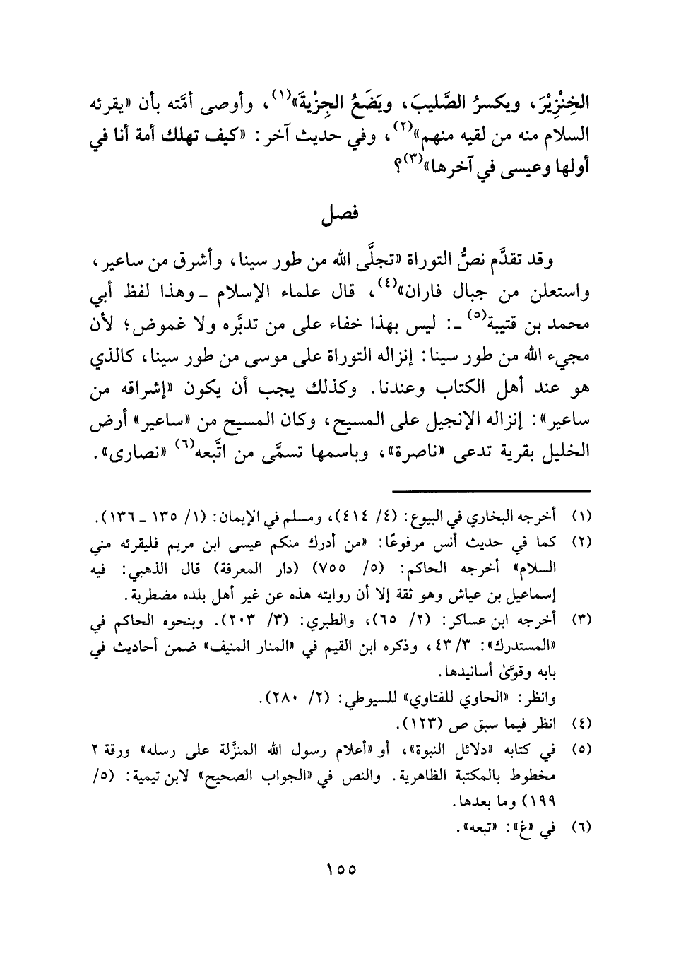 الخِنزيْرَ، ويكسرُ الصَّليبَ، ويَضَعُ الجِزْيةَ" (¬١)، وأوصي أمَّته بأن "يقرئه السلام منه من لقيه منهم" (¬٢)، وفي حديث آخر: "كيف تهلك أمة أنا في أولها وعيسي في آخرها" (¬٣)؟