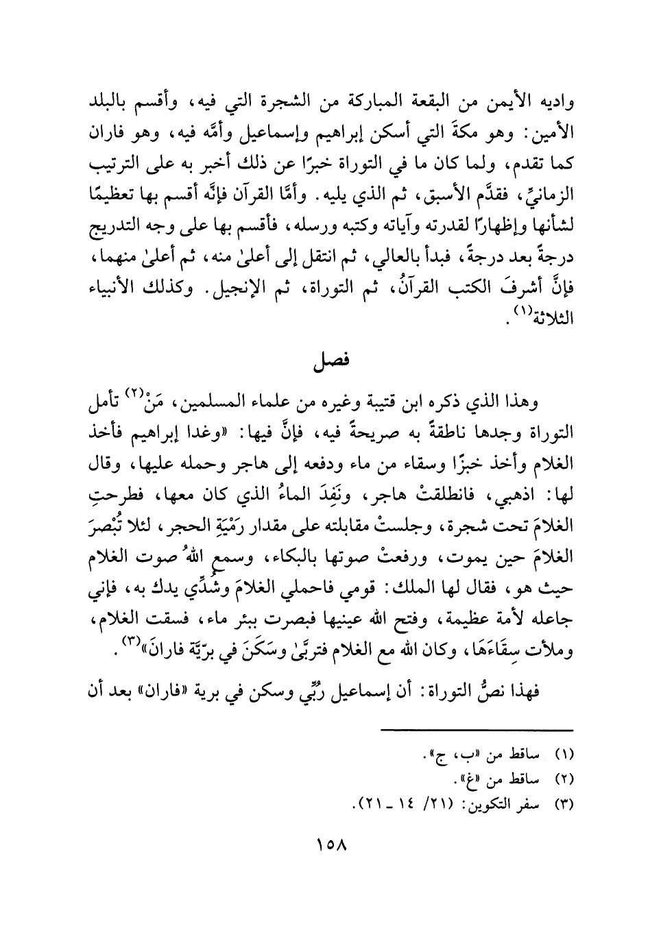 وهذا الذي ذكره ابن قتيبة وغيره من علماء المسلمين، مَنْ (¬٢) تأمل التوراة وجدها ناطقةً به صريحةً فيه، فإنَّ فيها: "وغدا إبراهيم فأخذ الغلام وأخذ خبزًا وسقاء من ماء ودفعه إلى هاجر وحمله عليها، وقال لها: اذهبي، فانطلقتْ هاجر، ونَفِدَ الماءُ الذي كان معها، فطرحتِ الغلامَ تحت شجرة، وجلستْ مقابلته علي مقدار رَمْيَةِ الحجر، لئلا تُبْصرَ الغلامَ حين يموت، ورفعتْ صوتها بالبكاء، وسمع اللهُ صوت الغلام حيث هو، فقال لها الملك: قومي فاحملي الغلامَ وشدِّي يدك به، فإني جاعله لأمة عظيمة، وفتح الله عينيها فبصرت ببئر ماء، فسقت الغلام، وملأت سِقَاءَهَا، وكان الله مع الغلام فتربَّى وسَكَنَ في برّيَّة فارانَ" (¬٣).