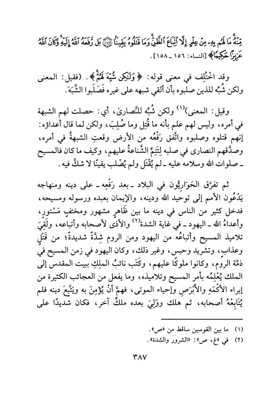 وقيل: المعنى) (¬١) ولكن شُبِّه للنَّصارى، أي: حصلت لهم الشبهة في أمره، وليس لهم علم بأنّه ما قُتِل وما صُلِبَ، ولكن لما قال أعداؤه: إنهم قتلوه وصلبوه واتَّفق رَفْعُه من الأرض وقعتِ الشبهةُ في أمره، وصدَّقهم النصارى في صلبه لِتَتِمَّ الشَّناعةُ عليهم، وكيف ما كان فالمسيح -صلوات الله وسلامه عليه- لم يُقْتَل ولم يُصْلب يقينًا لا شكَّ فيه.