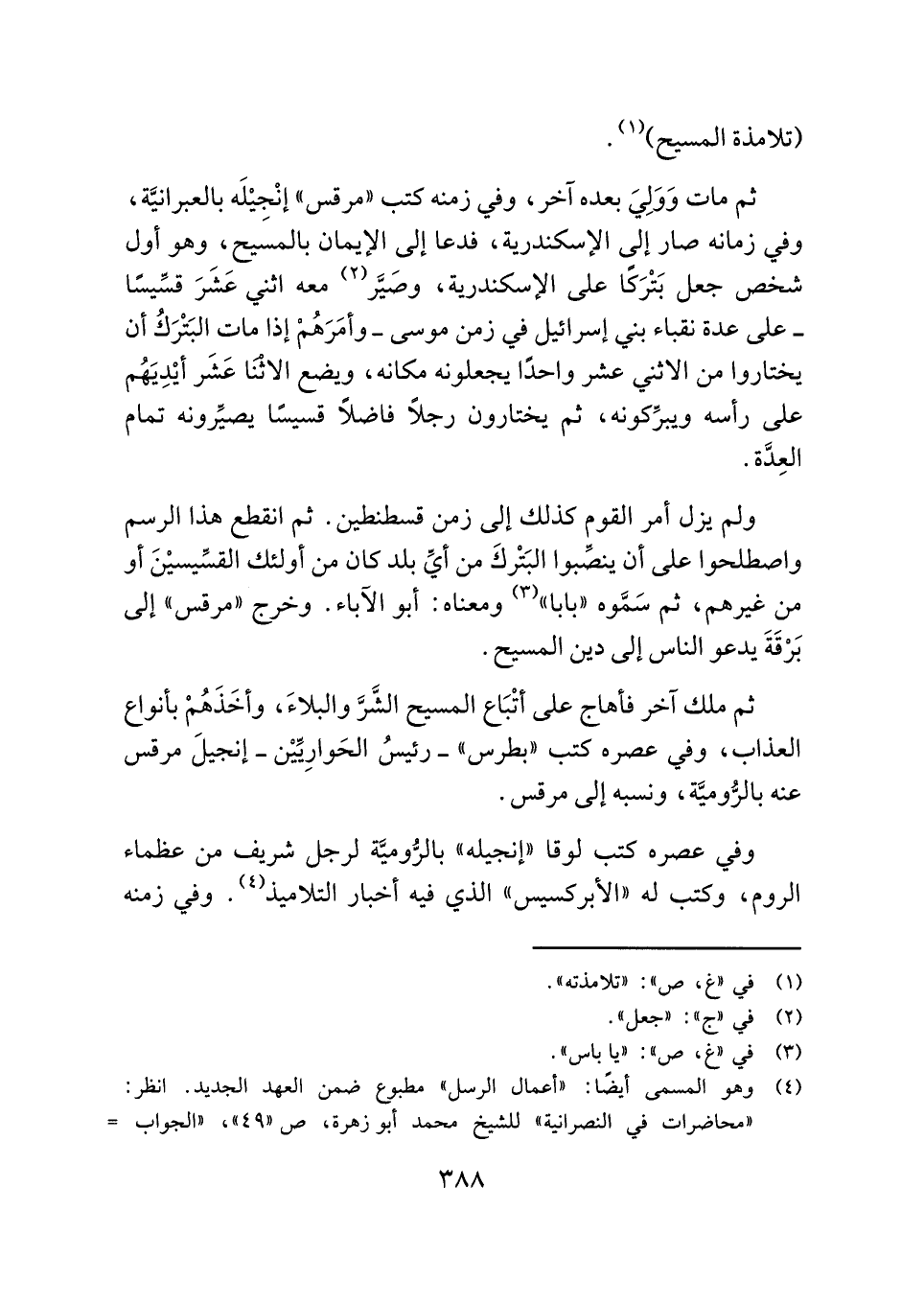 (¬٤) وهو المسمى أيضًا: "أعمال الرسل" مطبوع ضمن العهد الجديد. انظر: "محاضرات في النصرانية" للشيخ محمد أبو زهرة، ص "٤٩"، "الجواب =