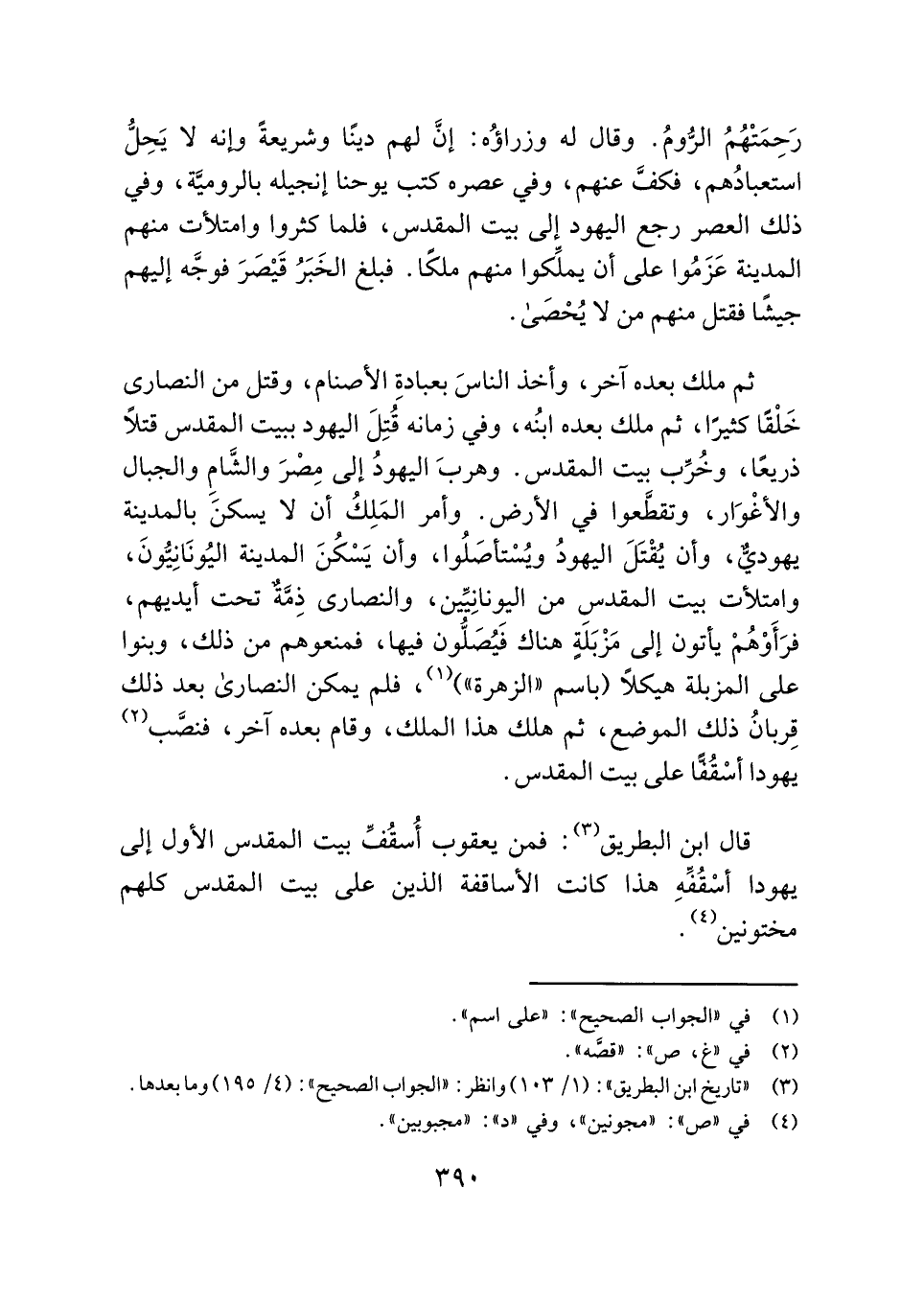 ثم ملك بعده آخر، وأخذ الناسَ بعبادةِ الأصنام، وقتل من النصارى خَلْقًا كثيرًا، ثم ملك بعده ابنُه، وفي زمانه قُتِلَ اليهود ببيت المقدس قتلًا ذريعًا، وخُرِّب بيت المقدس. وهربَ اليهودُ إلى مِصْرَ والشَّامِ والجبال والأغْوَار، وتقطَّعوا في الأرض. وأمر المَلِكُ أن لا يسكنَ بالمدينة يهوديٌّ، وأن يُقْتَلَ اليهودُ ويُسْتأصَلُوا، وأن يَسْكُنَ المدينة اليُونَانِيُّونَ، وامتلأت بيت المقدس من اليونانِيِّين، والنصارى ذِمَّةٌ تحت أيديهم، فرَأَوْهُمْ يأتون إلى مَزْبَلَةٍ هناك فَيُصَلُّون فيها، فمنعوهم من ذلك، وبنوا على المزبلة هيكلًا (باسم "الزهرة") (¬١) ، فلم يمكن النصارى بعد ذلك قِربانُ ذلك الموضع، ثم هلك هذا الملك، وقام بعده آخر، فنصَّب (¬٢) يهودا أسْقُفًّا على بيت المقدس.