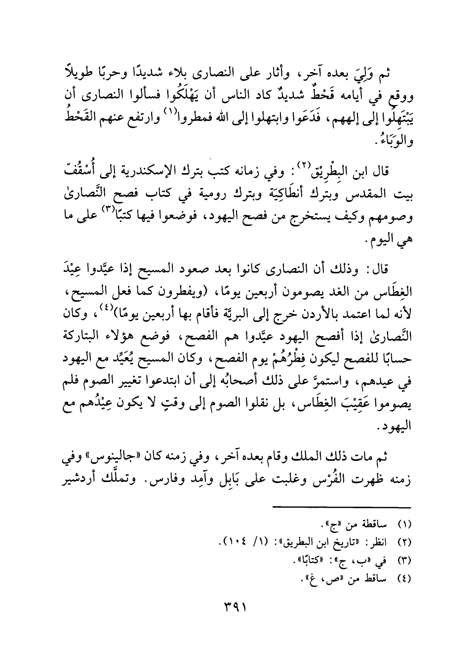 قال: وذلك أن النصارى كانوا بعد صعود المسيح إذا عيَّدوا عِيْدَ الغِطَاس من الغد يصومون أربعين يومًا، (ويفطرون كما فعل المسيح، لأنه لما اعتمد بالأردن خرج إلى البريَّة فأقام بها أربعين يومًا) (¬٤) ، وكان النَّصارى إذا أفصح اليهود عيَّدوا هم الفصح، فوضع هؤلاء البتاركة حسابًا للفصح ليكون فِطْرُهُمْ يوم الفصح، وكان المسيح يُعَيِّد مع اليهود في عيدهم، واستمرَّ على ذلك أصحابُه إلى أن ابتدعوا تغيير الصوم فلم يصوموا عَقِيْبَ الغِطَاس، بل نقلوا الصوم إلى وقتٍ لا يكون عِيْدُهم مع اليهود.