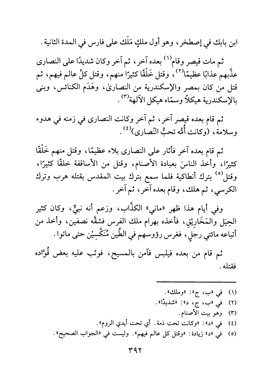 ثم قام بعده آخر فأثار على النصارى بلاء عظيمًا، وقتل منهم خَلْقًا كثيرًا، وأخذ الناسَ بعبادة الأصنام، وقتل من الأساقفة خلقًا كثيرًا، وقتل (¬٥) بترك أنطاكية فلما سمع بترك بيت المقدس بقتله هرب وترك الكرسي، ثم هلك، وقام بعده آخر، ثم آخر.