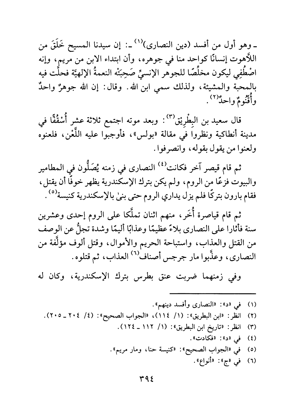 (¬٢) انظر: "ابن البطريق": (١/ ١١٤)، "الجواب الصحيح": (٤/ ٢٠٤ - ٢٠٥).