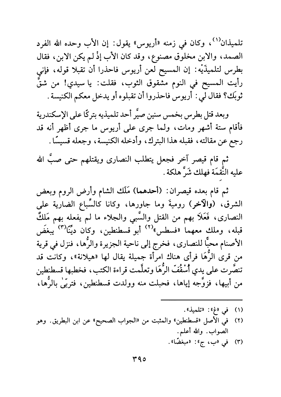(¬٢) في الأصل "قسطنطين" والمثبت من "الجواب الصحيح" عن ابن البطريق. وهو الصواب. والله أعلم.