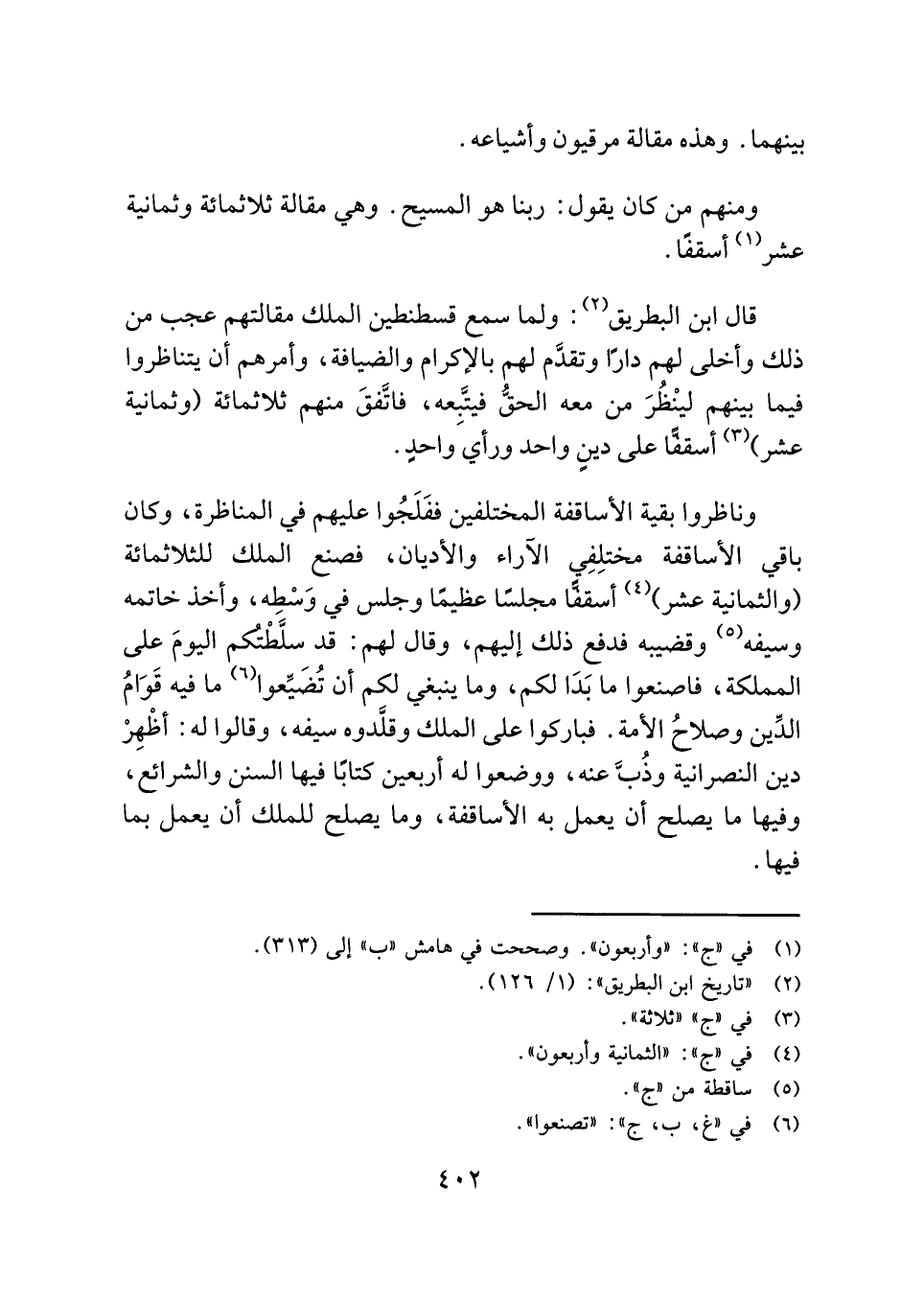 وناظروا بقية الأساقفة المختلفين ففَلَجُوا عليهم في المناظرة، وكان باقي الأساقفة مختلِفِي الآراء والأديان، فصنع الملك للثلاثمائة (والثمانية عشر) (¬٤) أسقفًّا مجلسًا عظيمًا وجلس في وَسْطِه، وأخذ خاتمه وسيفه (¬٥) وقضيبه فدفع ذلك إليهم، وقال لهم: قد سلَّطْتُكم اليومَ على المملكة، فاصنعوا ما بَدَا لكم، وما ينبغي لكم أن تُضَيِّعوا (¬٦) ما فيه قَوَامُ الدِّين وصلاحُ الأمة. فباركوا على الملك وقلَّدوه سيفه، وقالوا له: أظْهِرْ دين النصرانية وذُبَّ عنه، ووضعوا له أربعين كتابًا فيها السنن والشرائع، وفيها ما يصلح أن يعمل به الأساقفة، وما يصلح للملك أن يعمل بما فيها.