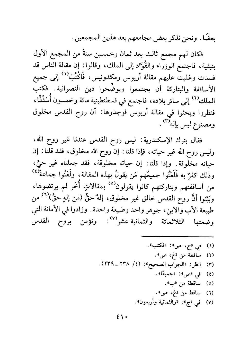 فقال بترك الإسكندرية: ليس روح القدس عندنا غير روح الله، وليس روح الله غير حياته، فإذا قلنا: إن روح الله مخلوق، فقد قلنا: إن حياته مخلوقة. وإذا قلنا: إن حياته مخلوقة، فقد جعلناه غير حيٍّ، وذلك كفرٌ به فَلَعَنُوا جميعُهم مَن يقولُ بهذه المقالة، ولَعَنُوا جماعةً (¬٤) من أساقفتهم وبتاركتهم كانوا يقولون (¬٥) بمقالاتٍ أُخَر لم يرتضوها، وبَيَّنوا أنَّ روح القدس خالق غير مخلوق، إلهٌ حقّ (من إلهٍ حقٍّ) (¬٦) من طبيعة الأب والابن، جوهر واحد وطبيعة واحدة. وزادوا في الأمانة التي وضعتها الثلاثمائة والثمانية عشر (¬٧) : ونؤمن بروح القدس