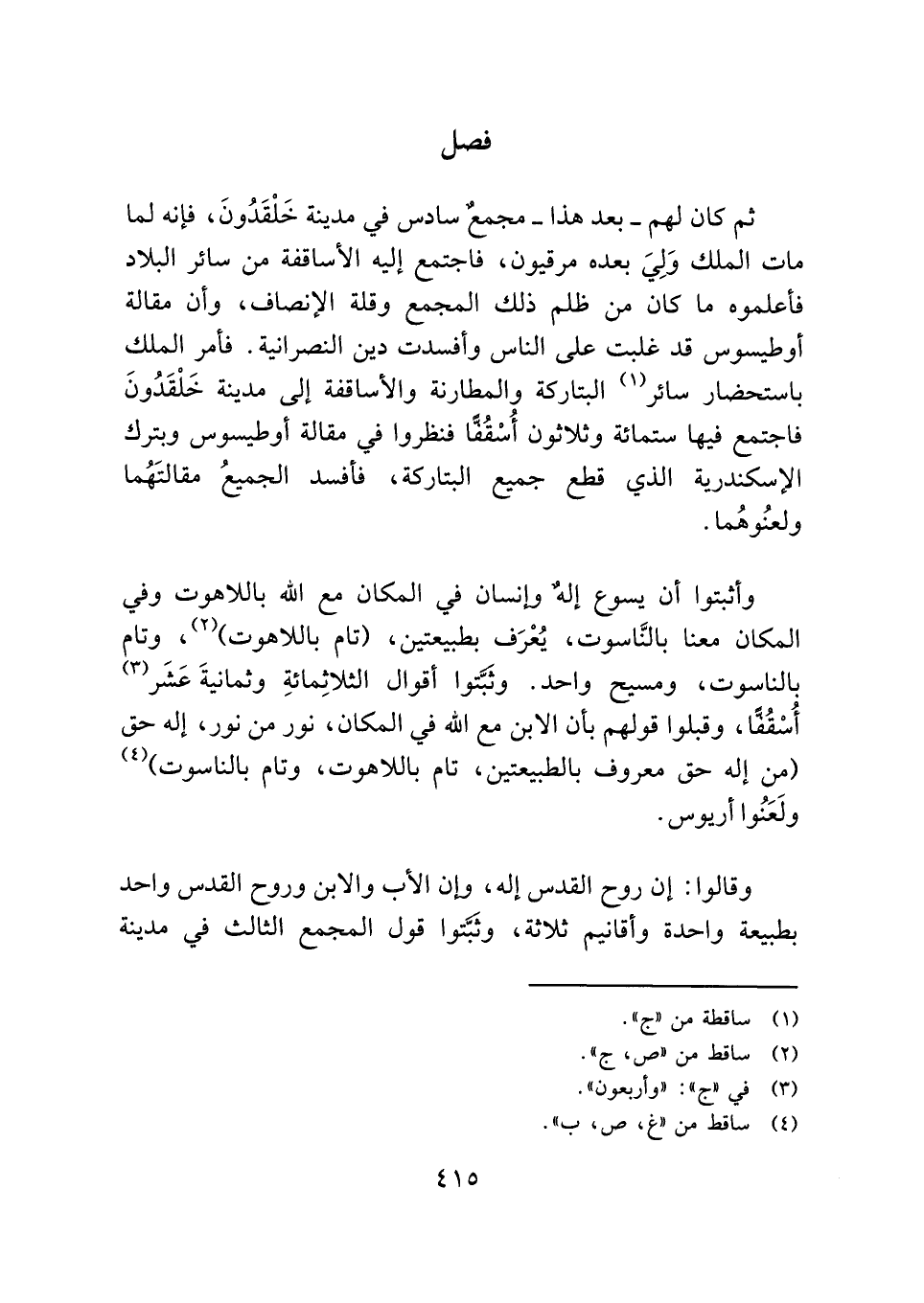 وأثبتوا أن يسوع إلهٌ وإنسان في المكان مع الله باللاهوت وفي المكان معنا بالنَّاسوت، يُعْرَف بطبيعتين، (تام باللاهوت) (¬٢)، وتام بالناسوت، ومسيح واحد. وثَبَّتوا أقوال الثلاثِمائةِ وثمانيةَ عَشَر (¬٣) أُسْقُفًّا، وقبلوا قولهم بأن الابن مع الله في المكان، نور من نور، إله حق (من إله حق معروف بالطبيعتين، تام باللاهوت، وتام بالناسوت) (¬٤) ولَعَنُوا أريوس.