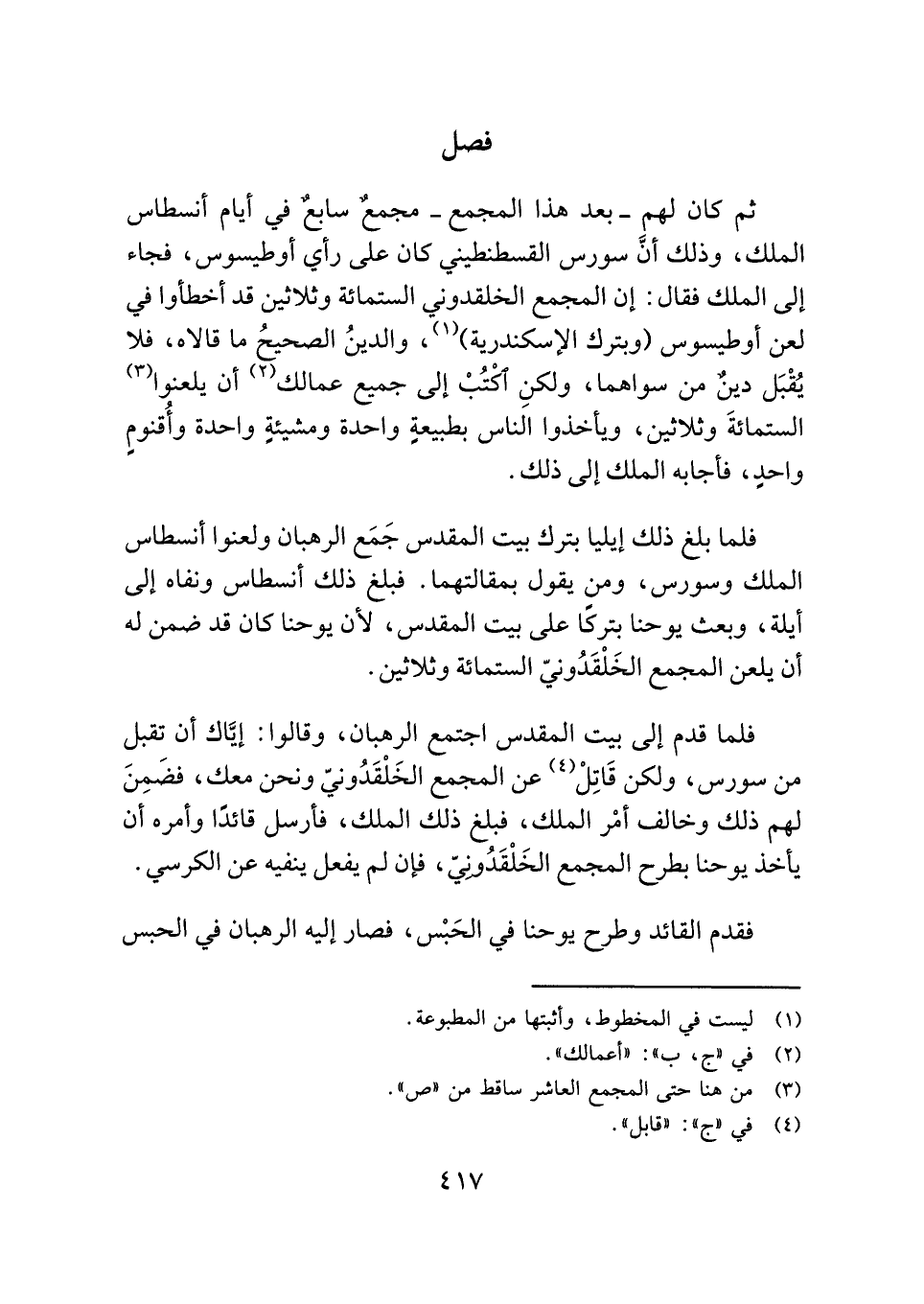 فلما قدم إلى بيت المقدس اجتمع الرهبان، وقالوا: إيَّاك أن تقبل من سورس، ولكن قَاتِلْ (¬٤) عن المجمع الخَلْقَدُونيّ ونحن معك، فضَمِنَ لهم ذلك وخالف أمْر الملك، فبلغ ذلك الملك، فأرسل قائدًا وأمره أن يأخذ يوحنا بطرح المجمع الخَلْقَدُونِيّ، فإن لم يفعل ينفيه عن الكرسي.