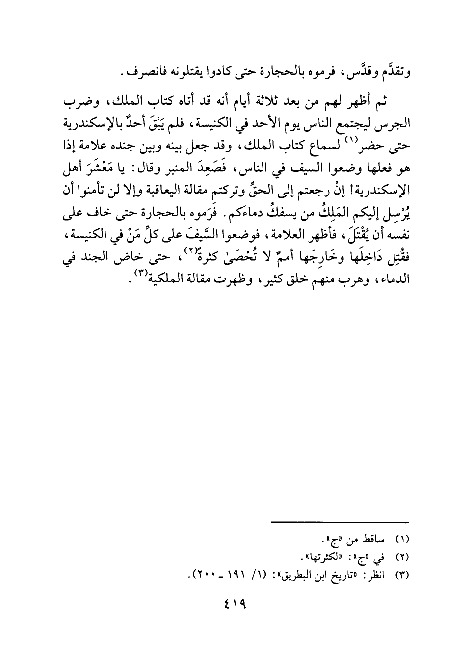 ثم أظهر لهم من بعد ثلاثة أيام أنه قد أتاه كتاب الملك، وضرب الجرس ليجتمع الناس يوم الأحد في الكنيسة، فلم يَبْقَ أحدٌ بالإسكندرية حتى حضر (¬١) لسماع كتاب الملك، وقد جعل بينه وبين جنده علامة إذا هو فعلها وضعوا السيف في الناس، فَصَعِدَ المنبر وقال: يا مَعْشَرَ أهل الإسكندرية! إنْ رجعتم إلى الحقِّ وتركتم مقالة اليعاقبة وإلا لن تأمنوا أن يُرْسِل إليكم المَلِكُ من يسفكُ دماءَكم. فَرَموه بالحجارة حتى خاف على نفسه أن يُقْتَلَ، فأظهر العلامة، فوضعوا السَّيفَ على كلِّ مَنْ في الكنيسة، فقُتِل دَاخِلَها وخَارِجَها أممٌ لا تُحْصَى كثرةً (¬٢) ، حتى خاض الجند في الدماء، وهرب منهم خلق كثير، وظهرت مقالة الملكية (¬٣) .