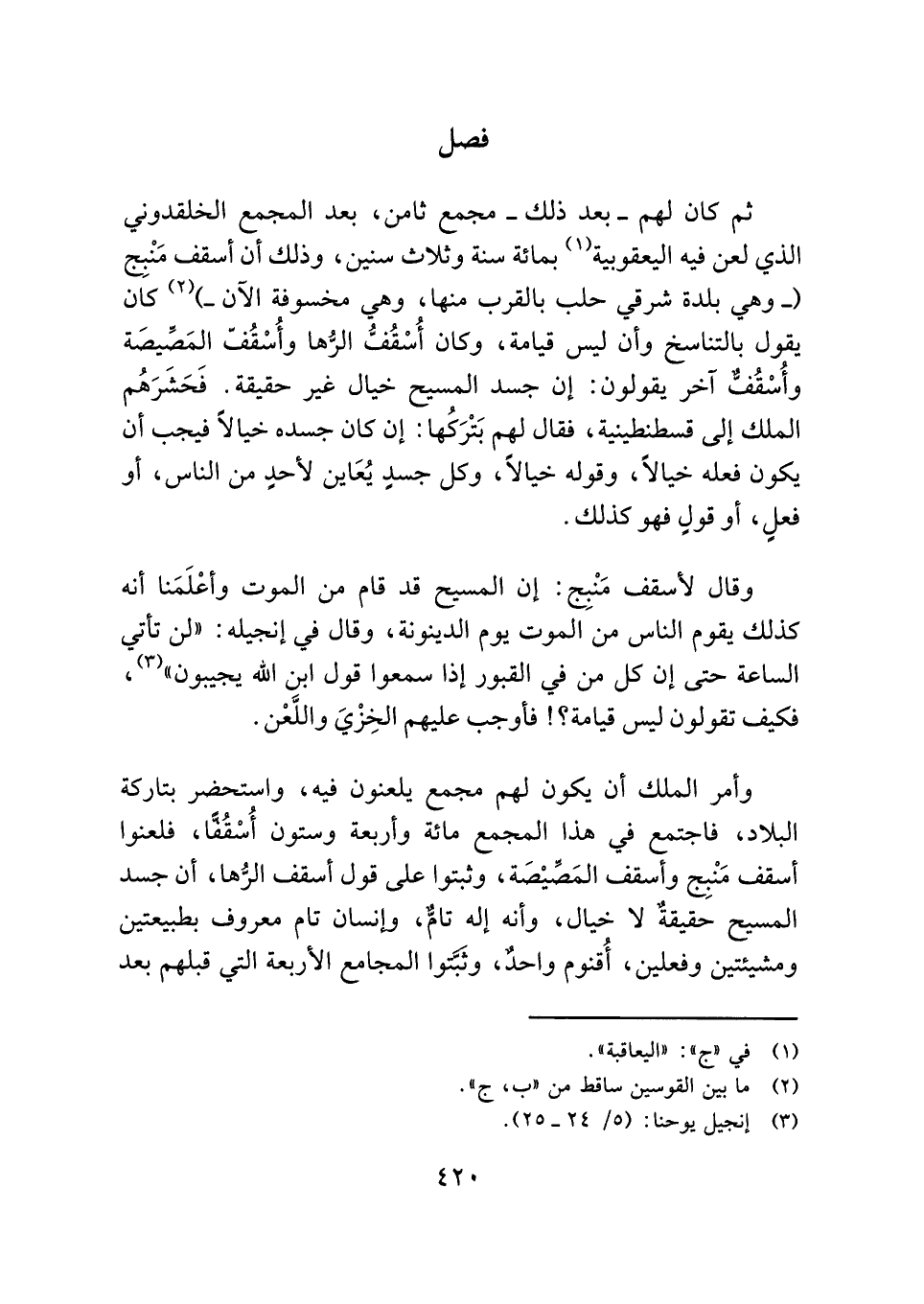 ثم كان لهم -بعد ذلك- مجمع ثامن، بعد المجمع الخلقدوني الذي لعن فيه اليعقوبية (¬١) بمائة سنة وثلاث سنين، وذلك أن أسقف مَنْبِج (-وهي بلدة شرقي حلب بالقرب منها، وهي مخسوفة الآن-) (¬٢) كان يقول بالتناسخ وأن ليس قيامة، وكان أُسْقُفُّ الرُّها وأُسْقُفّ المَصِّيصَة وأُسْقُفٌّ آخر يقولون: إن جسد المسيح خيال غير حقيقة. فَحَشَرَهُم الملك إلى قسطنطينية، فقال لهم بَتْرَكُها: إن كان جسده خيالًا فيجب أن يكون فعله خيالًا، وقوله خيالًا، وكل جسدٍ يُعَاين لأحدٍ من الناس، أو فعلٍ، أو قولٍ فهو كذلك.