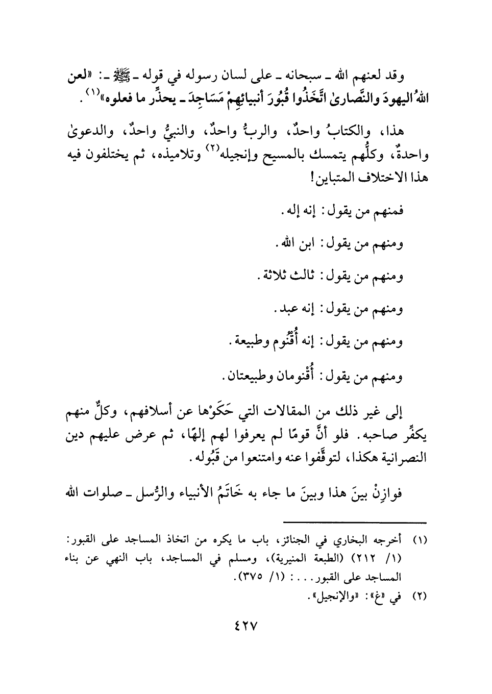 (¬١) أخرجه البخاري في الجنائز، باب ما يكره من اتخاذ المساجد على القبور: (١/ ٢١٢) (الطبعة المنيرية)، ومسلم في المساجد، باب النهي عن بناء المساجد على القبور ... : (١/ ٣٧٥).