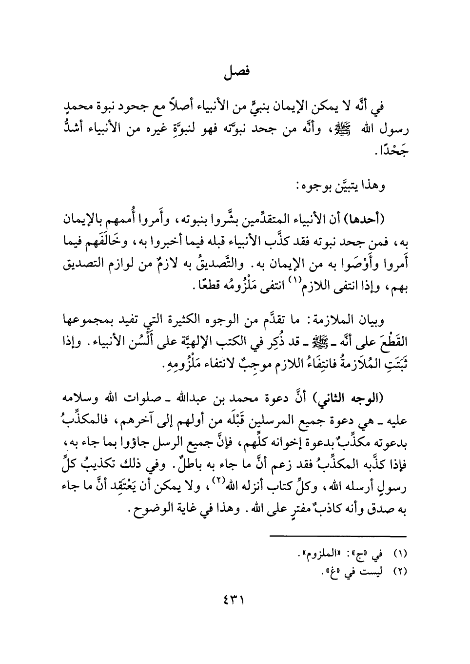 في أنه لا يمكن الإيمان بنبيٍّ من الأنبياء أصلًا مع جحود نبوة محمدٍ رسول الله - صلى الله عليه وسلم -، وأنَّه من جحد نبوَّته فهو لنبوَّةِ غيره من الأنبياء أشدُّ جَحْدًا.