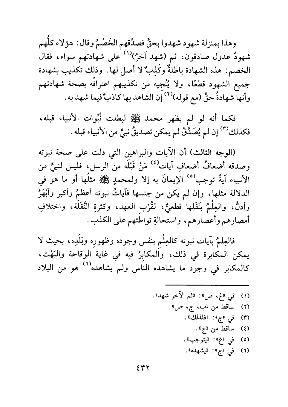 فالعِلمُ بآيات نبوته كالعِلْمِ بنفس وجوده وظهورِه وبَلَدِه، بحيث لا يمكن المكابرة في ذلك، والمكابِرُ فيه في غاية الوقاحة والبَهْت، كالمكابر في وجود ما يشاهده الناس ولم يشاهده (¬٦) هو من البلاد