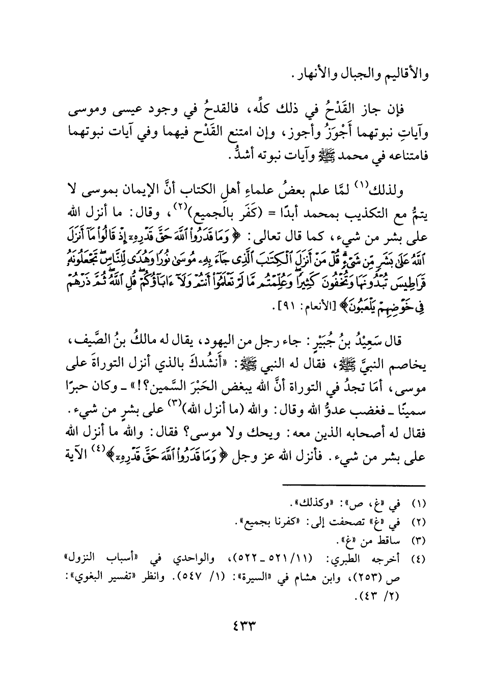 فإن جاز القَدْحُ في ذلك كلِّه، فالقدحُ في وجود عيسى وموسى وآياتِ نبوتهما أَجْوَزُ وأجوز، وإن امتنع القَدْح فيهما وفي آيات نبوتهما فامتناعه في محمد - صلى الله عليه وسلم - وآيات نبوته أشدُّ.