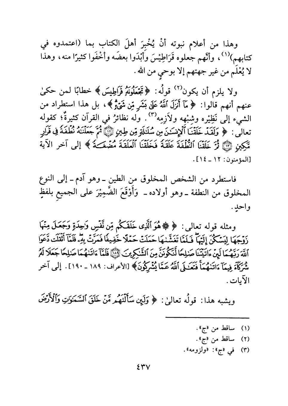 ولا يلزم أن يكون (¬٢) قولُه: {تَجْعَلُونَهُ قَرَاطِيسَ} خطابًا لمن حكى عنهم أنهم قالوا: {مَا أَنْزَلَ اللَّهُ عَلَى بَشَرٍ مِنْ شَيْءٍ}، بل هذا استطراد من الشيء إلى نَظِيْره وشِبْهِه ولَازِمِه (¬٣) . وله نظائرُ في القرآن كثيرةٌ؛ كقوله تعالى: {وَلَقَدْ خَلَقْنَا الْإِنْسَانَ مِنْ سُلَالَةٍ مِنْ طِينٍ (١٢) ثُمَّ جَعَلْنَاهُ نُطْفَةً فِي قَرَارٍ مَكِينٍ (١٣) ثُمَّ خَلَقْنَا النُّطْفَةَ عَلَقَةً فَخَلَقْنَا الْعَلَقَةَ مُضْغَةً} إلى آخر الآية [المؤمنون: ١٢ - ١٤].