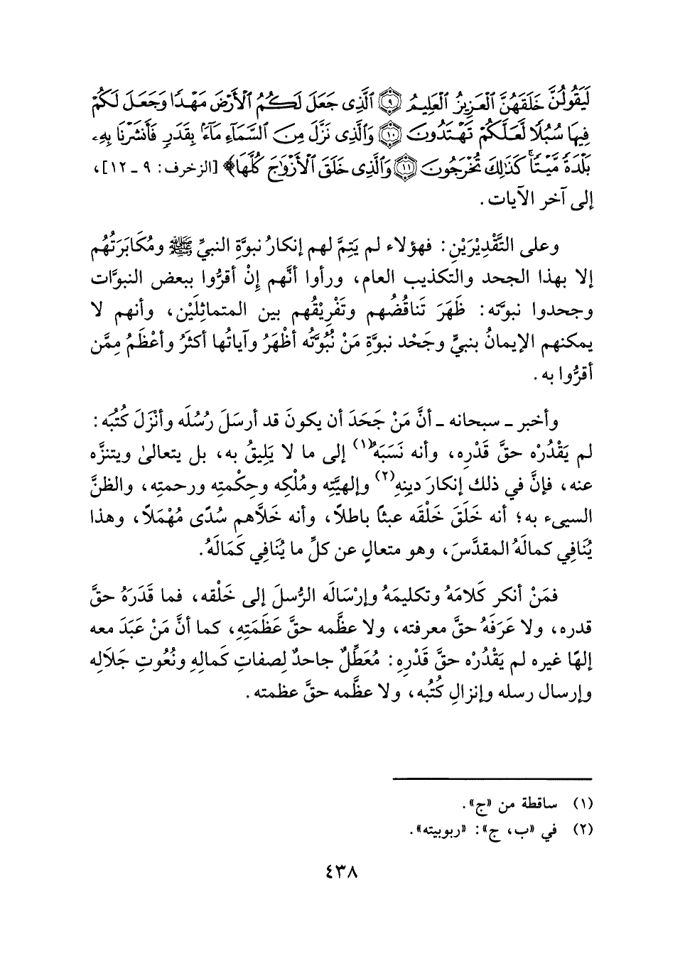 وعلى التَّقْدِيْرَيْنِ: فهؤلاء لم يَتِمَّ لهم إنكارُ نبوَّةِ النبيِّ - صلى الله عليه وسلم - ومُكَابَرَتُهُم إلا بهذا الجحد والتكذيب العام، ورأوا أنَّهم إِنْ أقرُّوا ببعض النبوَّات وجحدوا نبوَّته: ظَهَرَ تَناقُضُهم وتَفْريْقُهم بين المتماثِلَيْن، وأنهم لا يمكنهم الإيمانُ بنبيٍّ وجَحْد نبوَّةِ مَنْ نُبُوَّتُه أظْهَرُ وآياتُها أكثَرُ وأعْظَمُ مِمَّن أقرُّوا به.