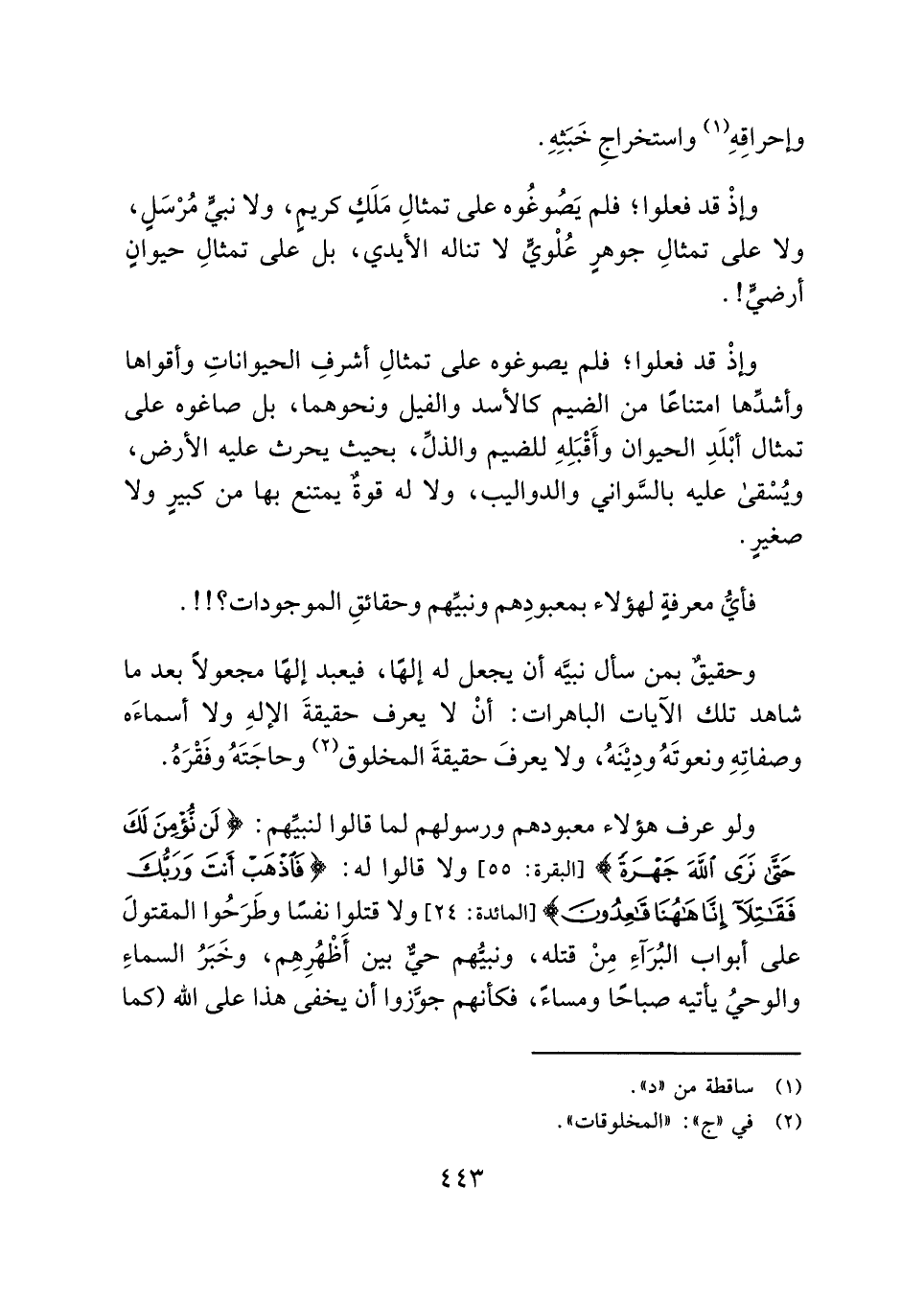 ولو عرف هؤلاء معبودهم ورسولهم لما قالوا لنبيِّهم: {لَنْ نُؤْمِنَ لَكَ حَتَّى نَرَى اللَّهَ جَهْرَةً} [البقرة: ٥٥] ولا قالوا له: {فَاذْهَبْ أَنْتَ وَرَبُّكَ فَقَاتِلَا إِنَّا هَاهُنَا قَاعِدُونَ} [المائدة: ٢٤] ولا قتلوا نفسًا وطَرَحُوا المقتولَ على أبواب البُرَآءِ مِنْ قتله، ونبيُّهم حيٌّ بين أَظْهُرِهِم، وخَبَرُ السماءِ والوحيُ يأتيه صباحًا ومساءً، فكأنهم جوَّزوا أن يخفى هذا على الله (كما