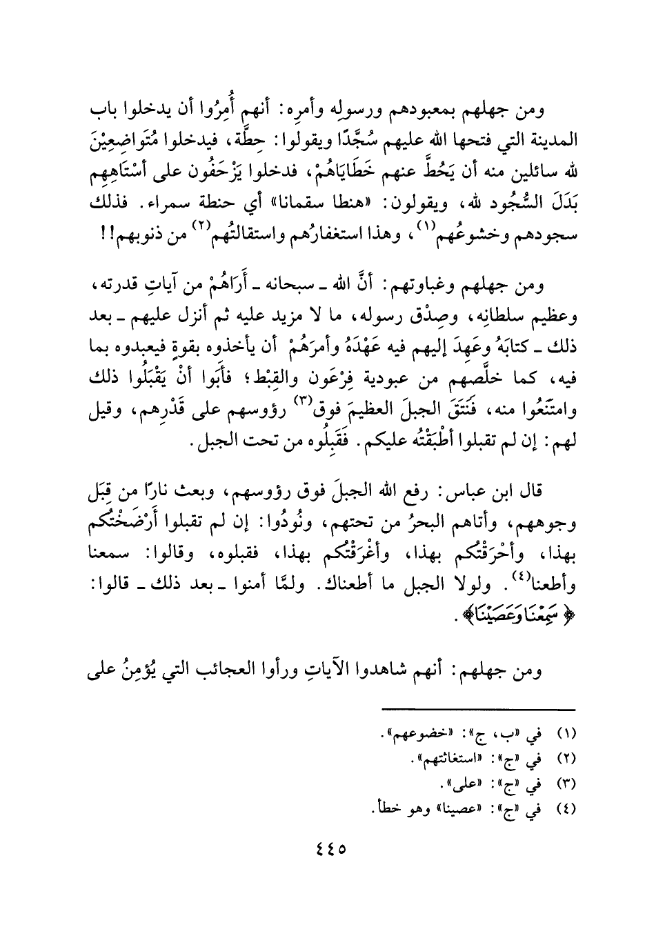 ومن جهلهم وغباوتهم: أنَّ الله -سبحانه- أَرَاهُمْ من آياتِ قدرته، وعظيم سلطانِه، وصِدْق رسوله، ما لا مزيد عليه ثم أنزل عليهم -بعد ذلك- كتابَهُ وعَهِدَ إليهم فيه عَهْدَهُ وأمرَهُمْ أن يأخذوه بقوةٍ فيعبدوه بما فيه، كما خلَّصهم من عبودية فِرْعَون والقِبْط؛ فأَبَوا أنْ يَقْبَلُوا ذلك وامتَنعُوا منه، فَنَتَقَ الجبلَ العظيمَ فوق (¬٣) رؤوسهم على قَدْرِهم، وقيل لهم: إن لم تقبلوا أطْبَقْتُه عليكم. فَقَبِلُوه من تحت الجبل.