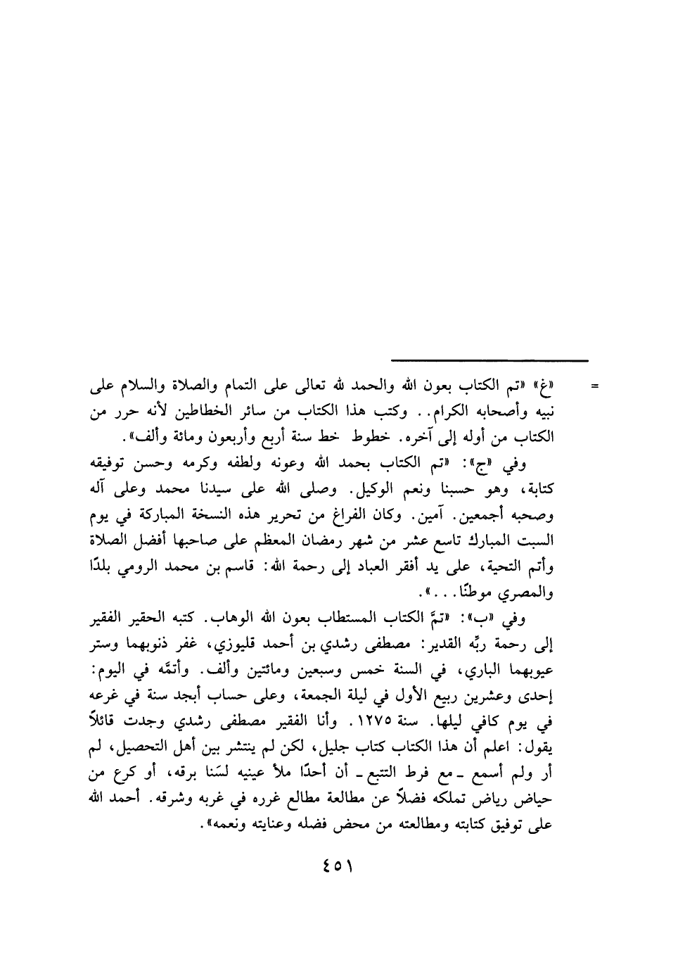 وفي "ب": "تمَّ الكتاب المستطاب بعون الله الوهاب. كتبه الحقير الفقير إلى رحمة ربِّه القدير: مصطفى رشدي بن أحمد قليوزي، غفر ذنوبهما وستر عيوبهما الباري، في السنة خمس وسبعين ومائتين وألف. وأتمَّه في اليوم: إحدى وعشرين ربيع الأول في ليلة الجمعة، وعلى حساب أبجد سنة في غرعه في يوم كافي ليلها. سنة ١٢٧٥. وأنا الفقير مصطفى رشدي وجدت قائلًا يقول: اعلم أن هذا الكتاب كتاب جليل، لكن لم ينتشر بين أهل التحصيل، لم أر ولم أسمع -مع فرط التتبع- أن أحدًا ملأ عينيه لسَنا برقه، أو كرع من حياض رياض تملكه فضلًا عن مطالعة مطالع غرره في غربه وشرقه. أحمد الله على توفيق كتابته ومطالعته من محض فضله وعنايته ونعمه".