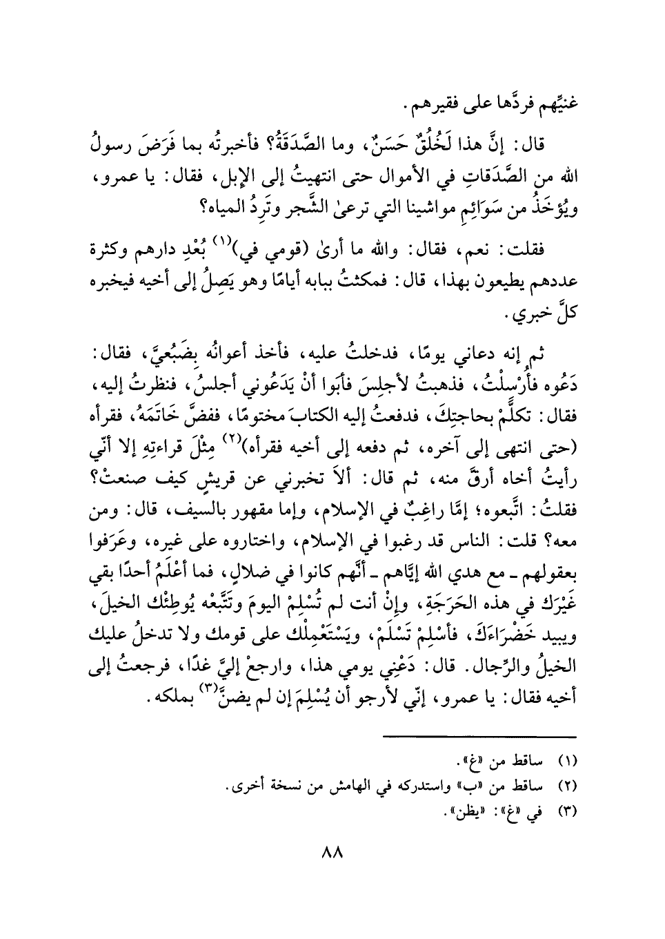 قال: إنَّ هذا لَخُلُقٌ حَسَنٌ، وما الصَّدَقَةُ؟ فأخبرتُه بما فَرَضَ رسولُ الله من الصَّدَقاتِ في الأموال حتى انتهيتُ إلى الإبل، فقال: يا عمرو، ويُؤخَذُ من سَوَائِمِ مواشينا التي ترعى الشَّجر وتَرِدُ المياه؟