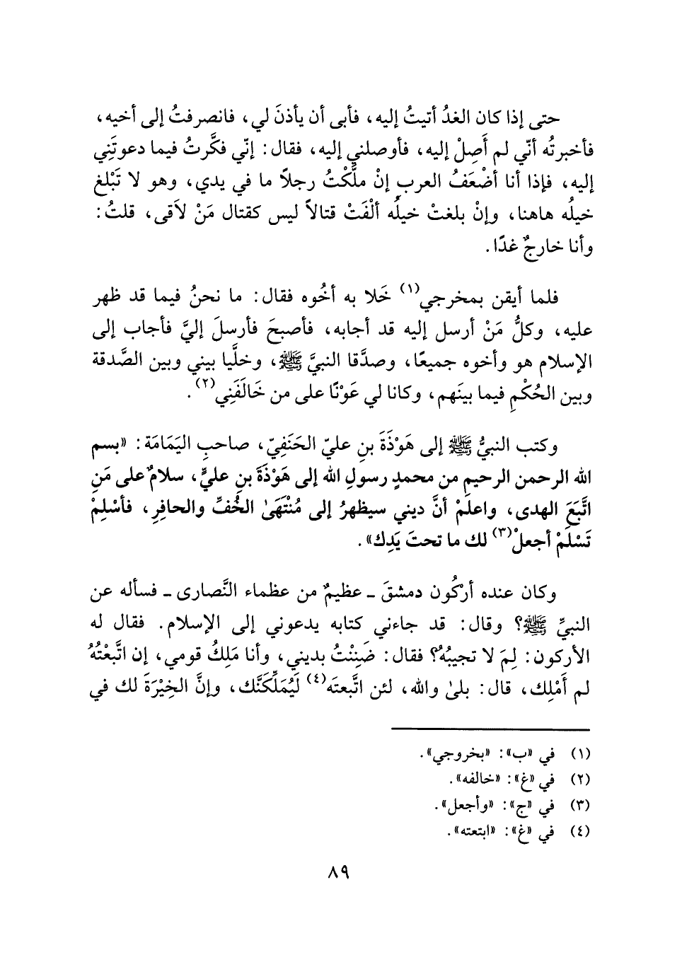 وكتب النبيُّ - صلى الله عليه وسلم - إلى هَوْذَةَ بنِ عليّ الحَنَفِيّ، صاحب اليَمَامَة: "بِسْمِ اللَّهِ الرَّحْمَنِ الرَّحِيمِ من محمدٍ رسولِ الله إلى هَوْذَةَ بن عليٍّ، سلامٌ على مَنِ اتَّبَعَ الهدى، واعلَمْ أنَّ ديني سيظهرُ إلى مُنْتَهَى الخُفِّ والحافِرِ، فأسْلِمْ تَسْلَمْ أجعلْ (¬٣) لك ما تحتَ يَدِك".